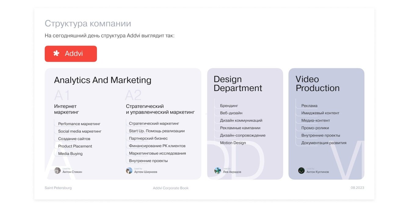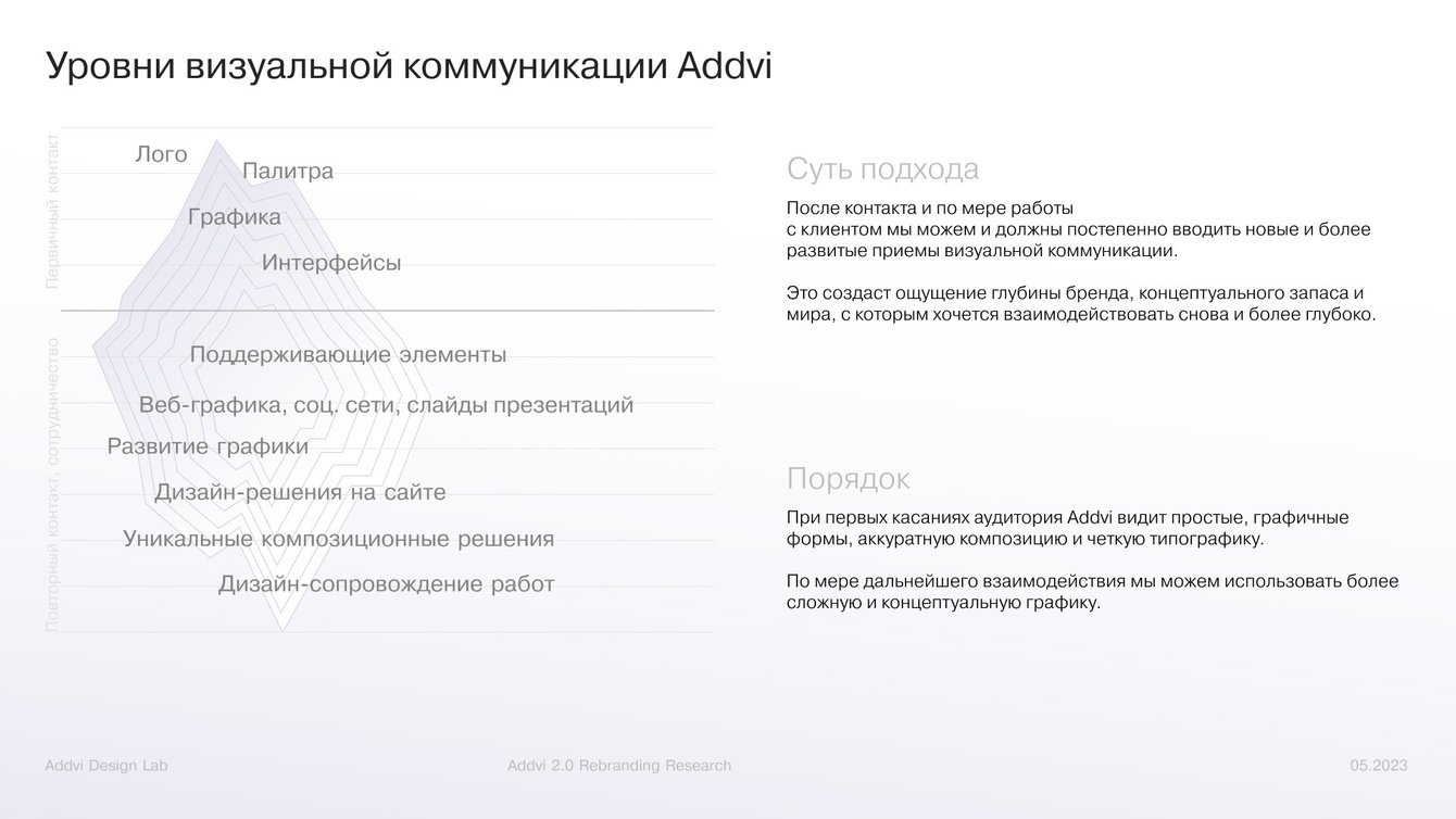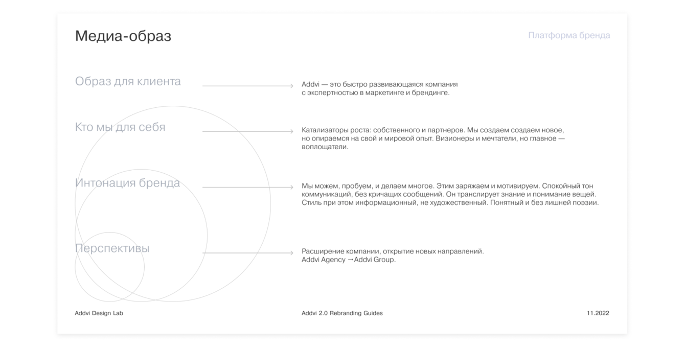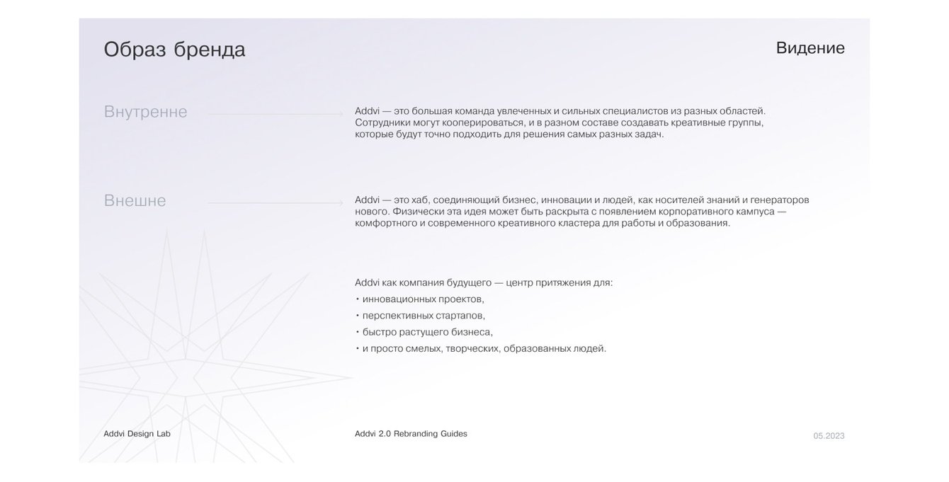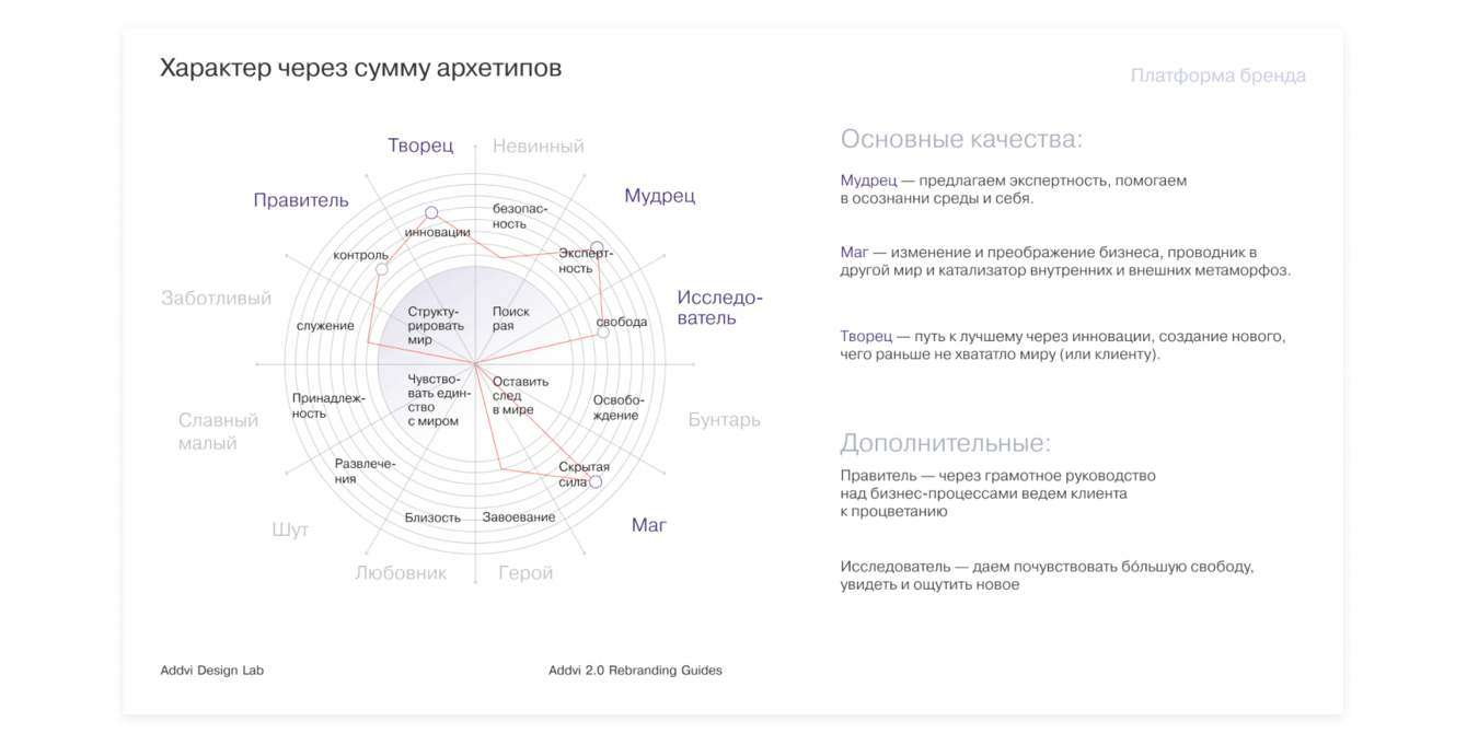 За следующие 2 месяца мы переработали результаты исследований в объемный документ с платформой бренда Addvi. Определили характер и качества, уникальный образ, тон коммуникации, паттерны поведения с клиентами / сотрудниками / партнерами, позиционирование на рынке и план развития каждого подразделения Addvi.