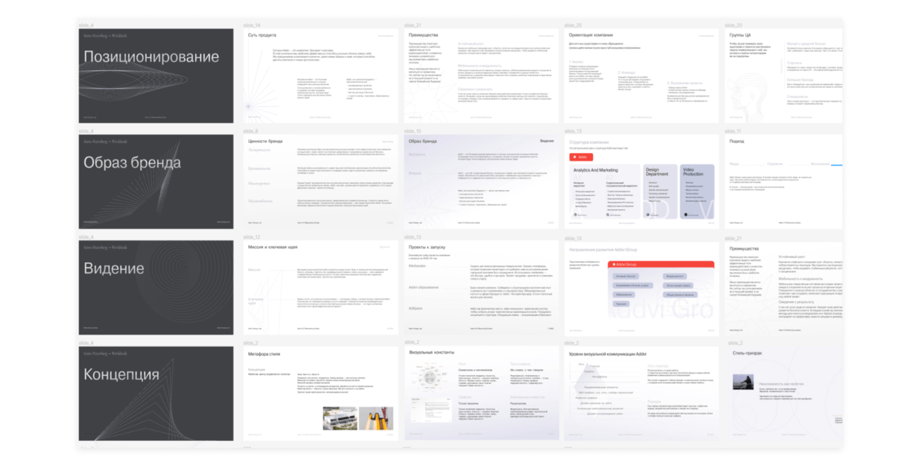 За следующие 2 месяца мы переработали результаты исследований в объемный документ с платформой бренда Addvi. Определили характер и качества, уникальный образ, тон коммуникации, паттерны поведения с клиентами / сотрудниками / партнерами, позиционирование на рынке и план развития каждого подразделения Addvi.
