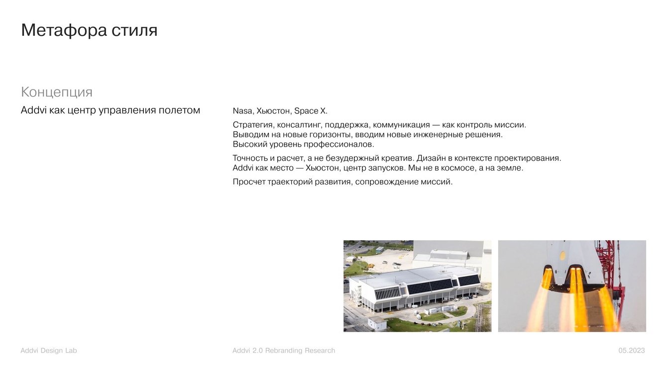 «Addvi как центр управления полетом» — в этот тезис мы вложили основные ценностные ориентации агентства. Стратегия, консалтинг, поддержка, коммуникация, разработка новых решений и инструментов — как контроль миссии. Точный и прагматичный подход к бизнесу, дизайну и инновациям — это то, что делает нас собой.