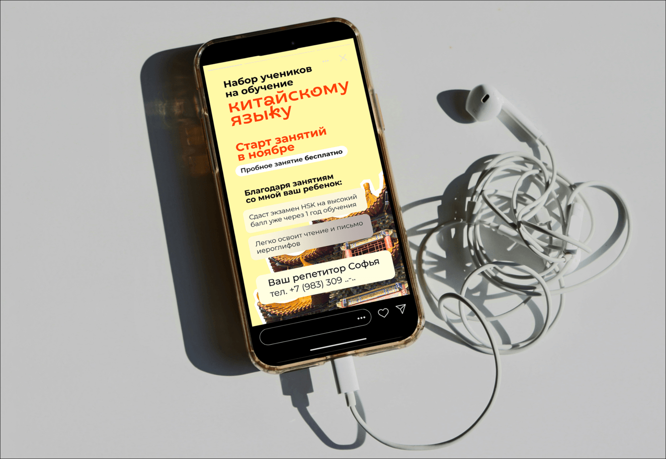 Разработать дизайн поста для сторис (stories) для репетитора китайского языка, который