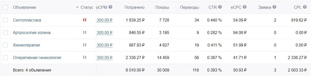 Вести эффективные рекламные кампании хирургии не просто. Сложно её даже запустить — объявления имеют особые требования при модерации, которых нет в инструкциях. Кроме тематики, есть и другие сложности. Мы нашли по меньшей мере 11 аналогичных клиник, которые рекламировались одновременно с нами на тех же площадках — конкуренция в Москве высокая. Рекламируемая клиника не из дешевых и рассчитана на состоятельных клиентов. Мы не можем позволить себе использовать щедрые акции, которые имеют высокую конверсию, например бесплатный первичный осмотр врачом.