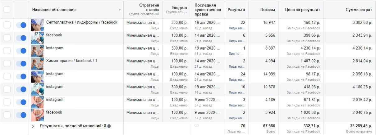 Запускаться решили сразу в трех соцсетях: Facebook, Instagram, ВКонтакте. Чем больше охват тестового запуска, тем быстрее мы определим оптимальную стратегию для каждой площадки и аудитории.В общей сложности рекламная кампания длилась два месяца. В процессе ведения мы каждые 2 дня или 20-30 тысяч показов оптимизировали настройки рекламы, сужали и расширяли аудитории, варьировали бюджеты, отключали слабые объявления.