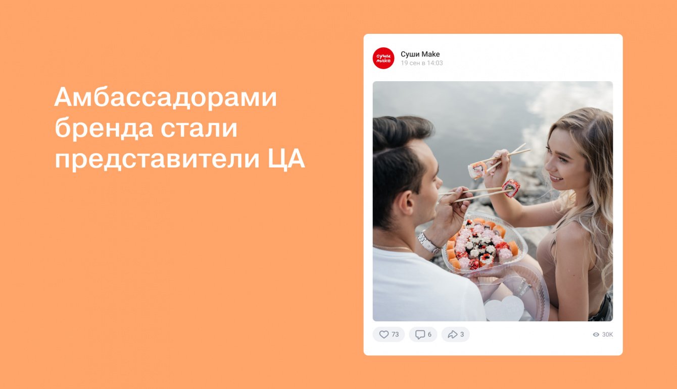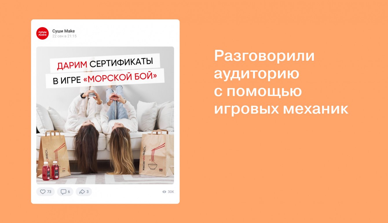 Разговорили аудиторию в аккаунтах «Суши Make» с помощью игровых механик. Начали проводить геймификации с поощрением призами и без, постепенно наша аудитория начала коммуницировать с брендом и друг другом даже без дополнительных стимулов. У нас появились адвокаты бренда, а общая тональность коммуникации сменилась с негативной на позитивную.