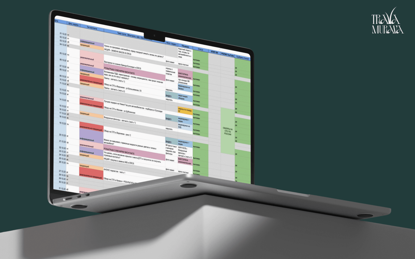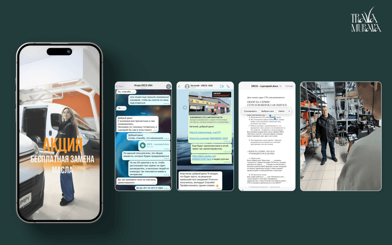Таким образом, тестовый ролик в отпуске превратился в часть стратегии, для которой в дальнейшем уже готовили сценарии, раскадровки, тексты, организовывали выезд съемочной группы, авиа-, ж/д- билеты, гостиницы и прочее. Иногда из подручных материалов собирали необходимый реквизит, а прямо за оператором ходила основатель TRAVA MURAVA и подсказывала текст сотрудникам автосервиса.