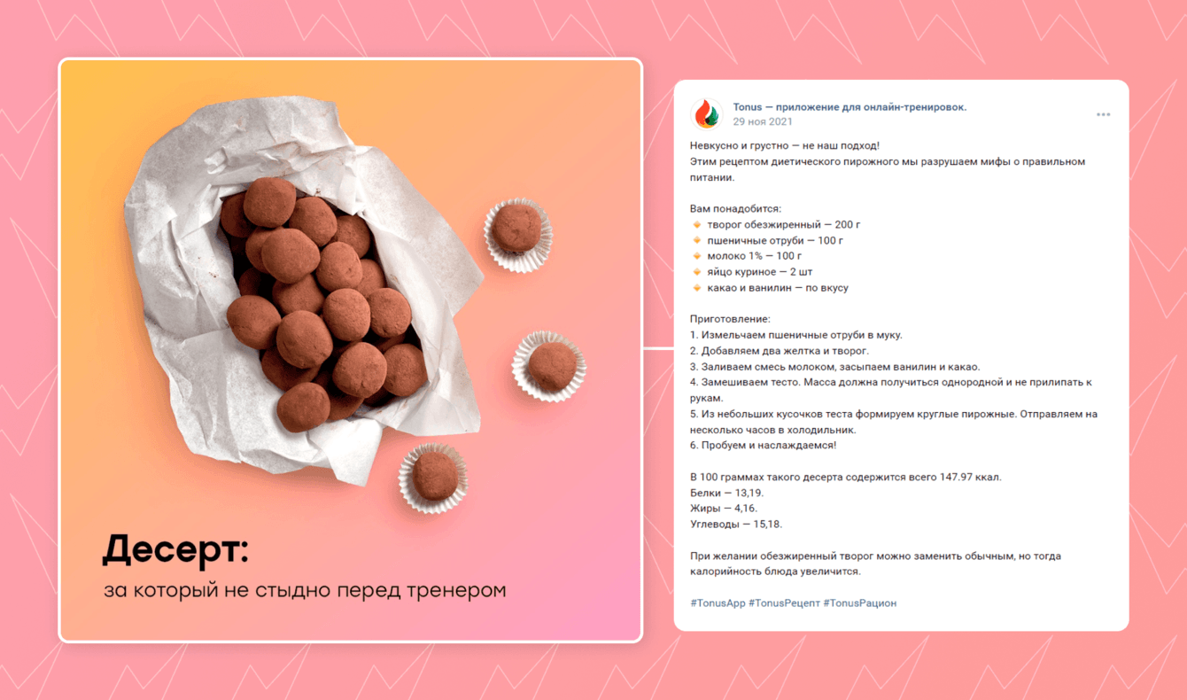 Формировали экспертизу онлайн-сервиса и лояльность аудитории через публикации, посвященные не только спорту, но и другим сферам здорового образа жизни — например, питанию. Выкладывали ПП-рецепты и полезные рационы.