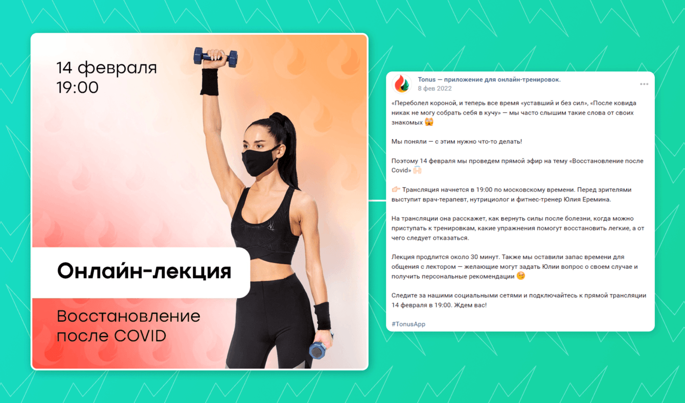 Делали анонсы новых фитнес-программ и мероприятий бренда; мотивировали аудиторию скачать приложение или познакомиться с продуктами Tonus поближе.