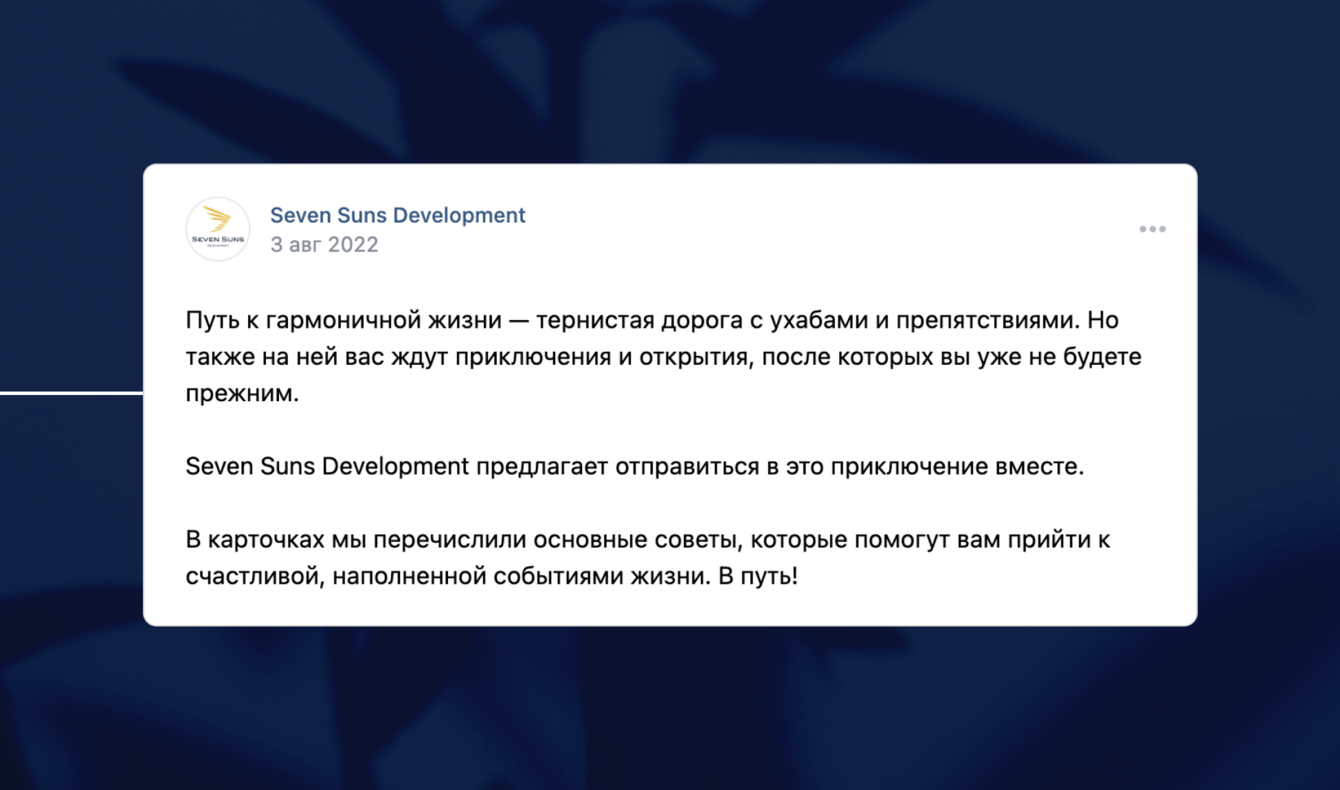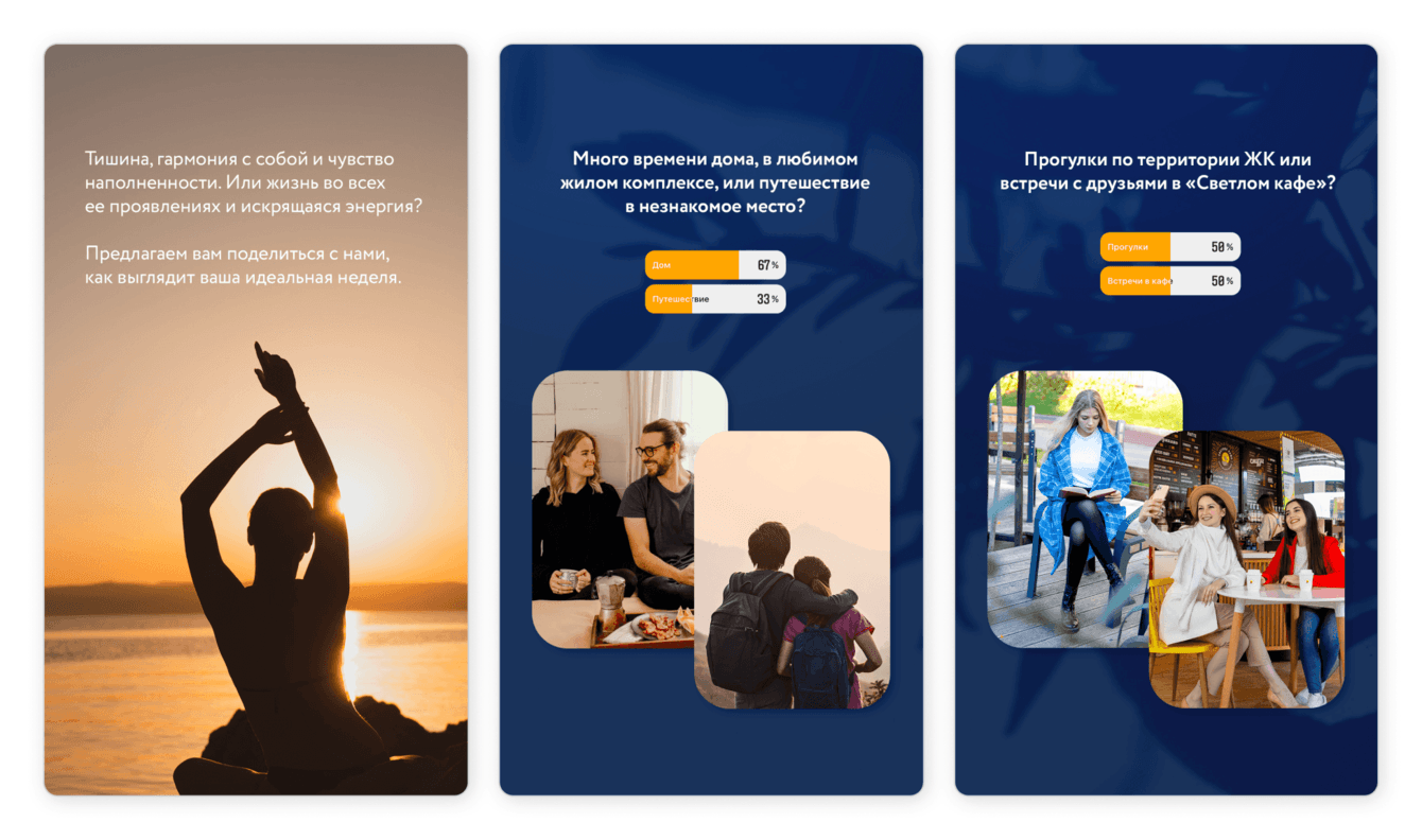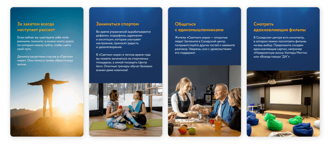 Философию девелопера раскрывали через разные форматы — описание подхода к оформлению территории проектов, близкие по духу цитаты, формирование ценностей — таких, как забота о природе и помощь животным.