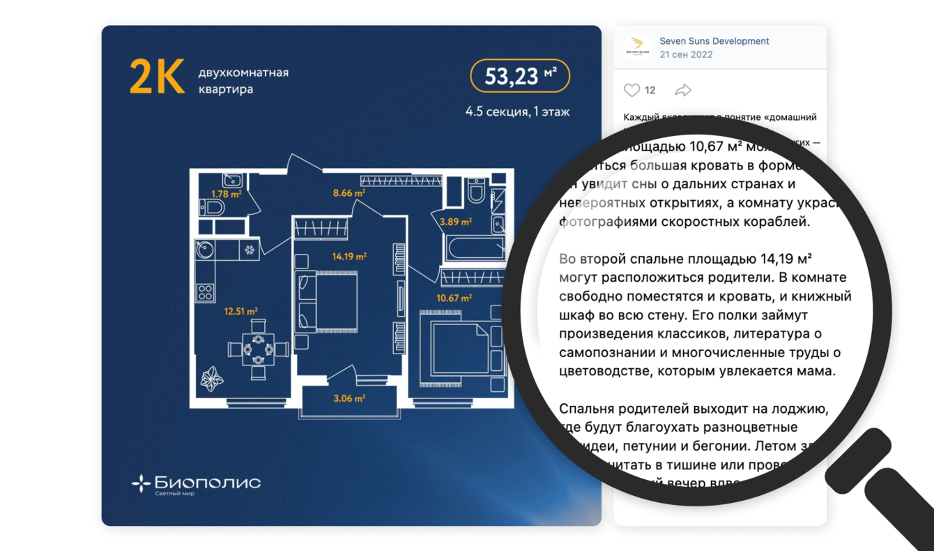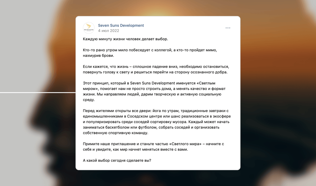 Погрузили будущих жителей в концепцию «Светлого мира» через нативные лайфстайл-публикации и полезные посты. И охватили более двух миллионов пользователей!