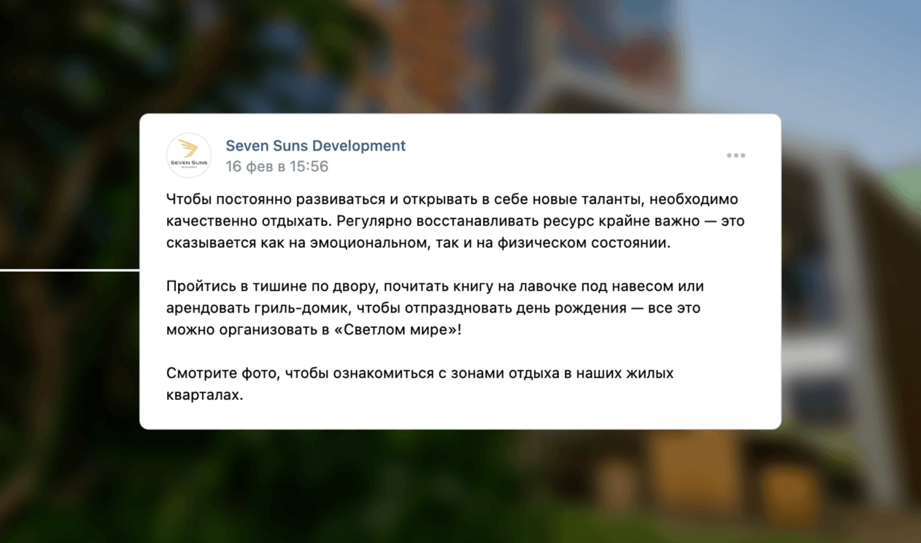 Seven Suns Development — современная и технологичная строительная компания, которая реализует масштабные проекты комплексного развития территорий. Через идею «Светлый мир» он меняет жизнь к лучшему.