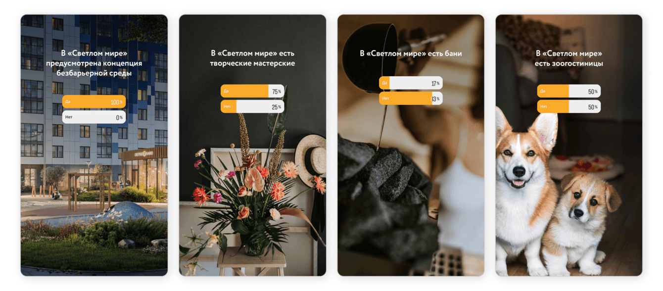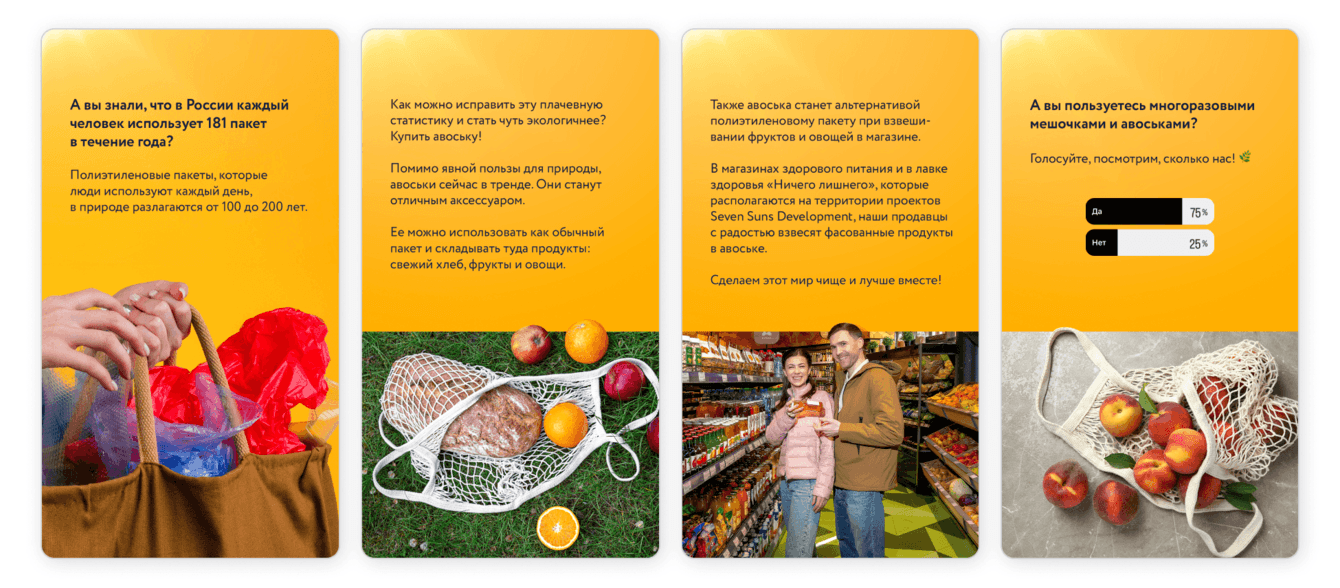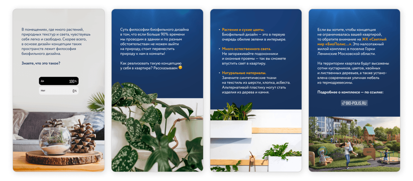 Чтобы нативно показать преимущества проекта, мы делали полезные Stories. Так через идеи оформления квартиры, экологичные советы и поддерживающие Stories рассказали о преимуществах проекта.