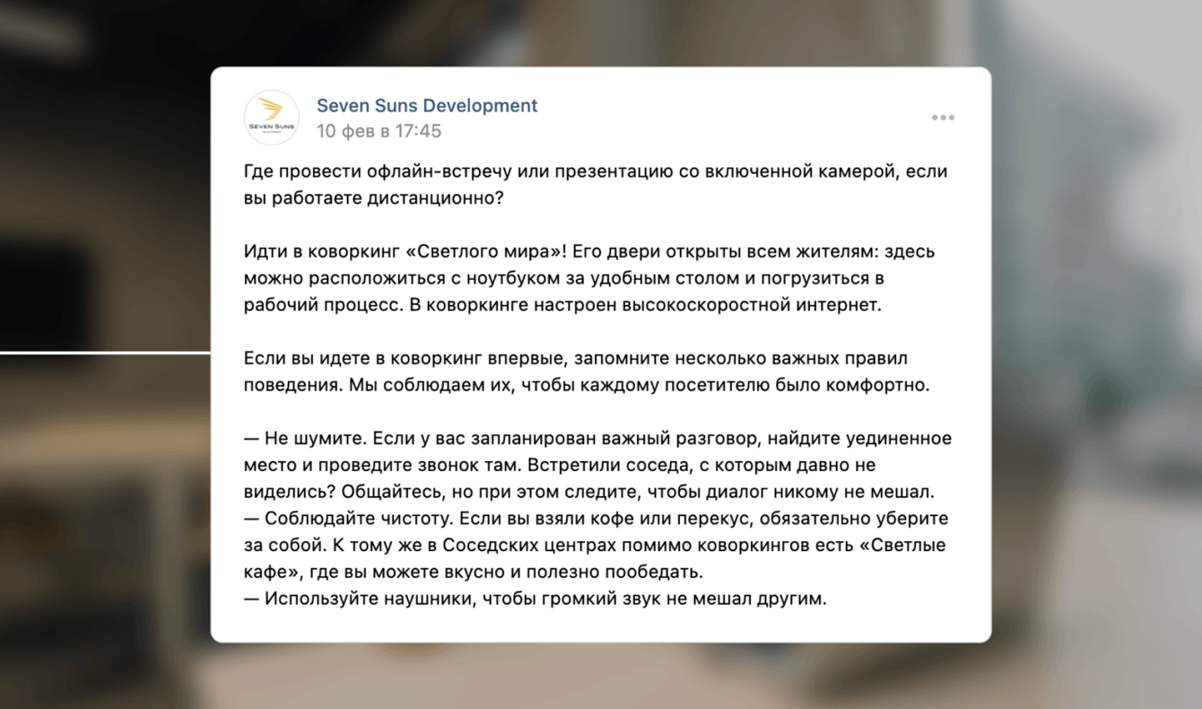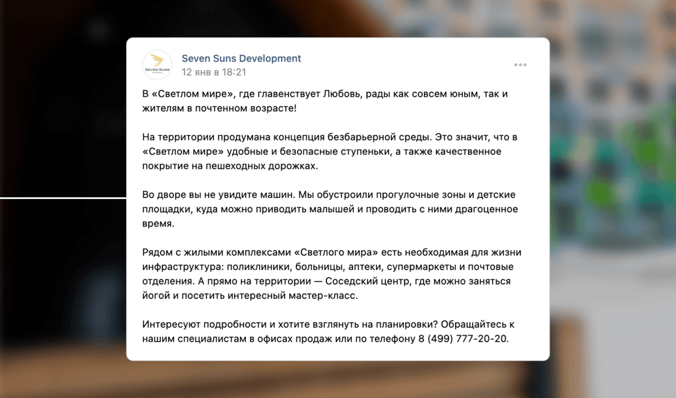 Мы подчеркивали уникальные преимущества — рассказывали о зонах отдыха, коворкингах, соседских центрах и ресторанах на территории жилых комплексов.