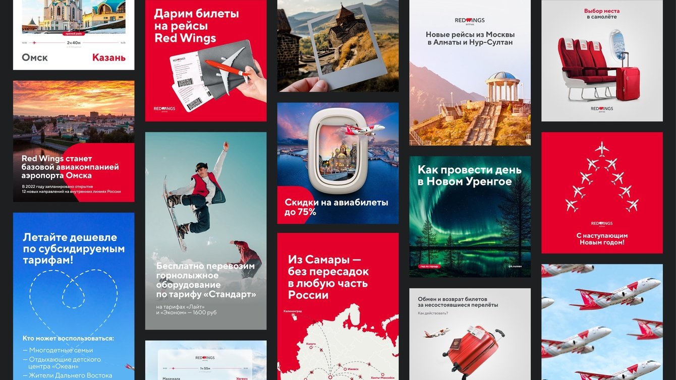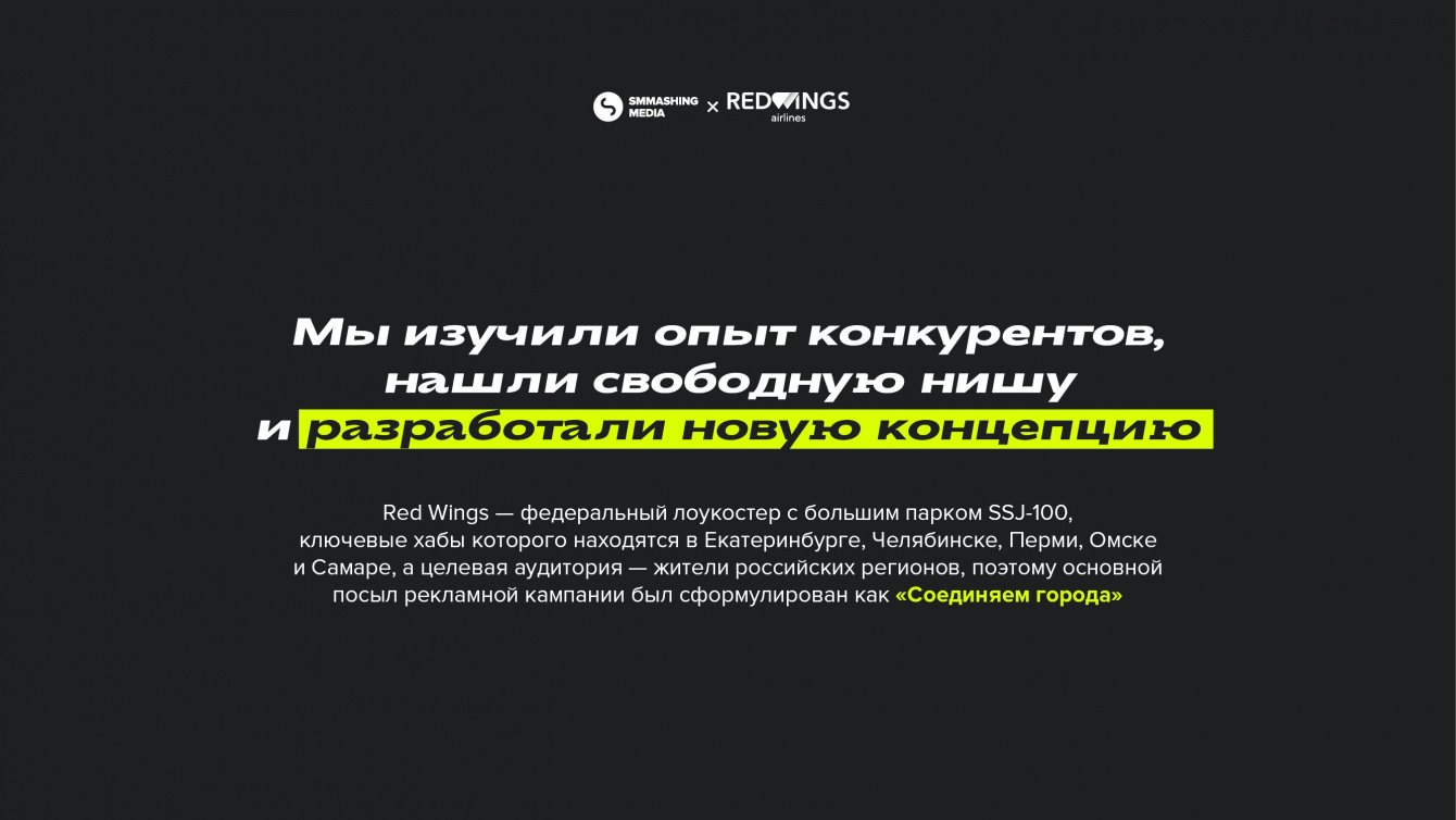 Red Wings — федеральный лоукостер с большим парком SSJ-100, ключевые хабы которого находятся в Екатеринбурге, Челябинске, Перми, Омске и Самаре, а целевая аудитория — жители российских регионов, поэтому основной посыл рекламной кампании был сформулирован как «Соединяем города».