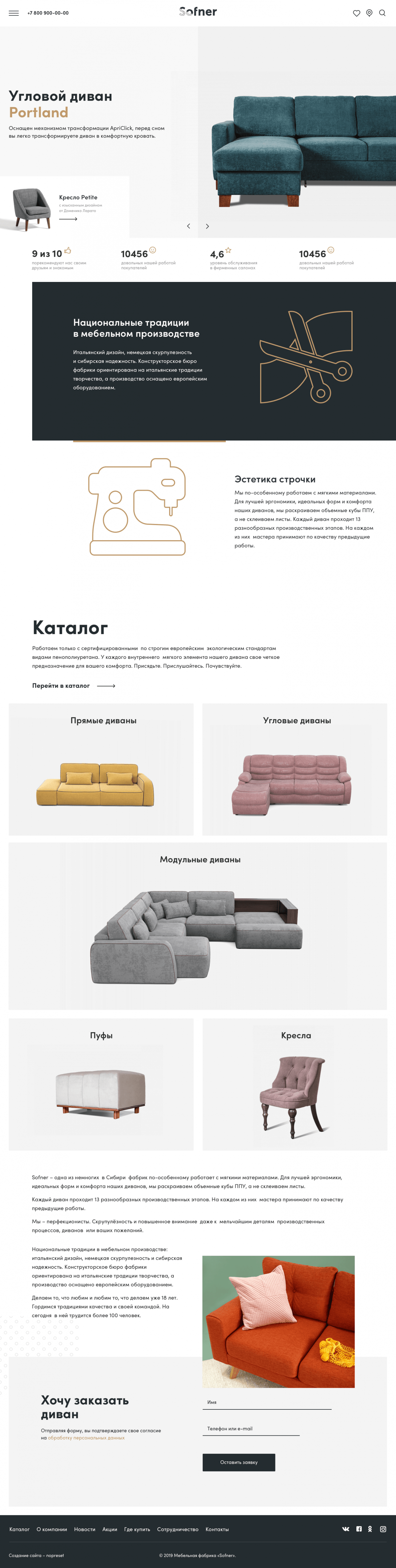 Главная страница — промо-слайдер с уникальной анимацией, информация о производстве и каталог.