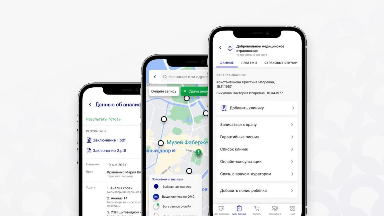Медицинские данные — заключения врачей, анализы, прививки — хранятся в единой медкарте пользователя. Отдельно представлена медкарта ребенка, если у него есть полис ДМС.