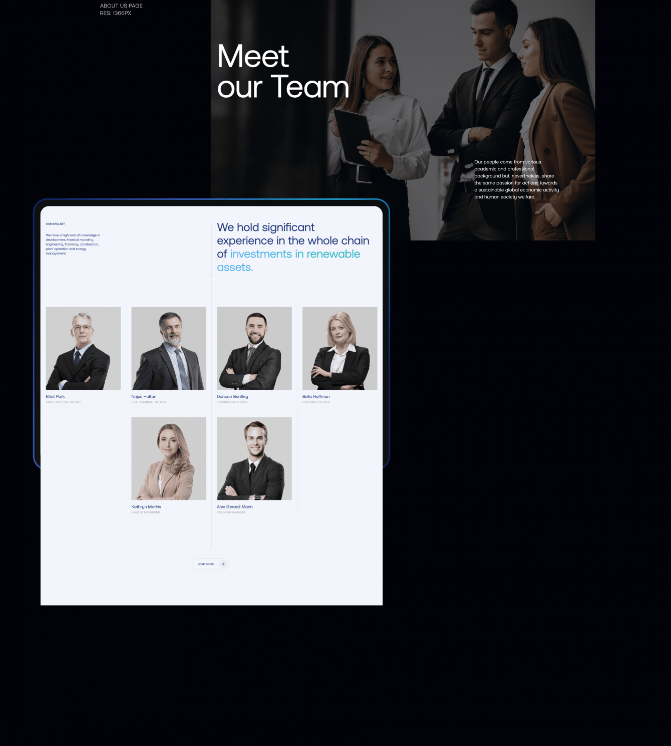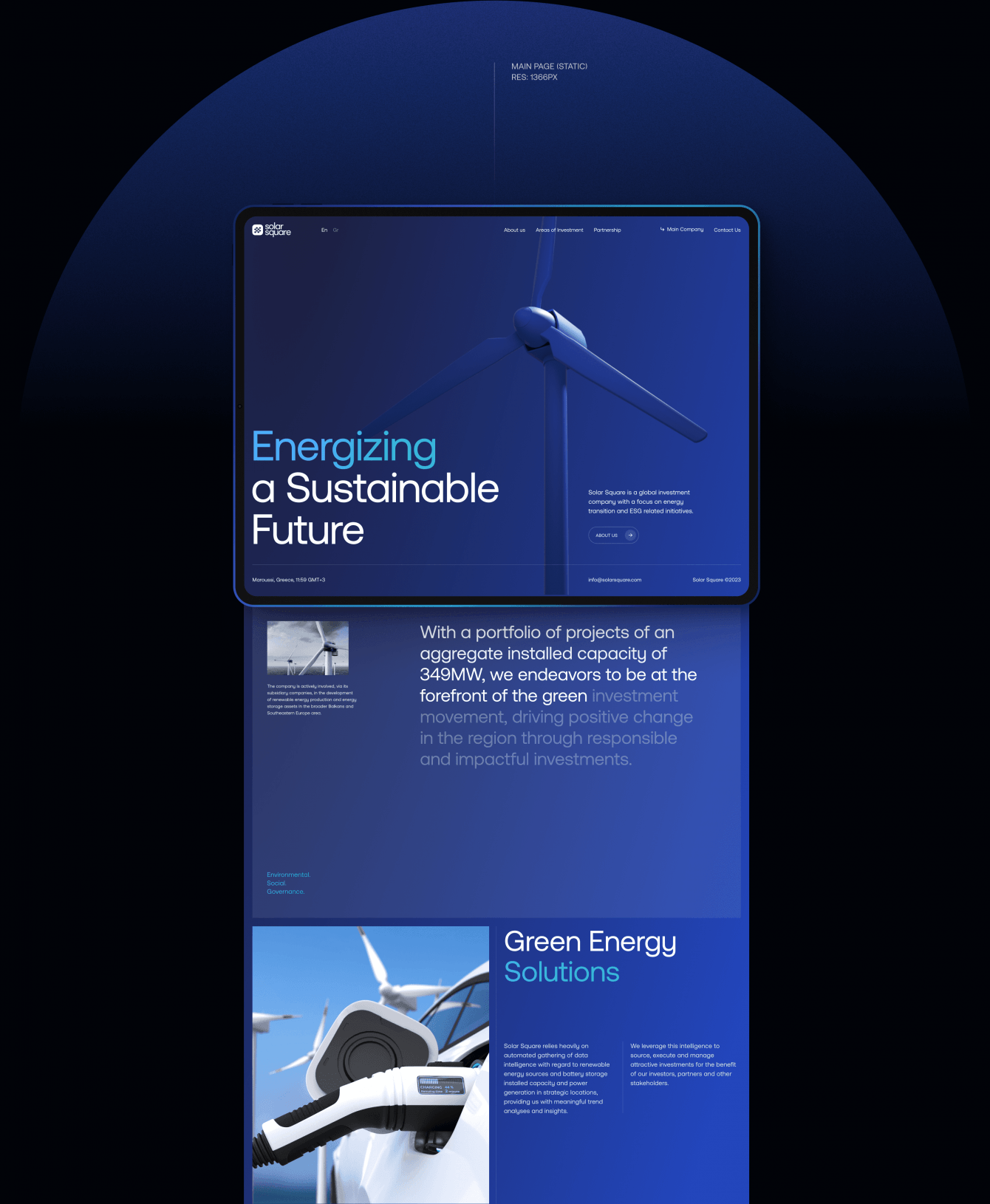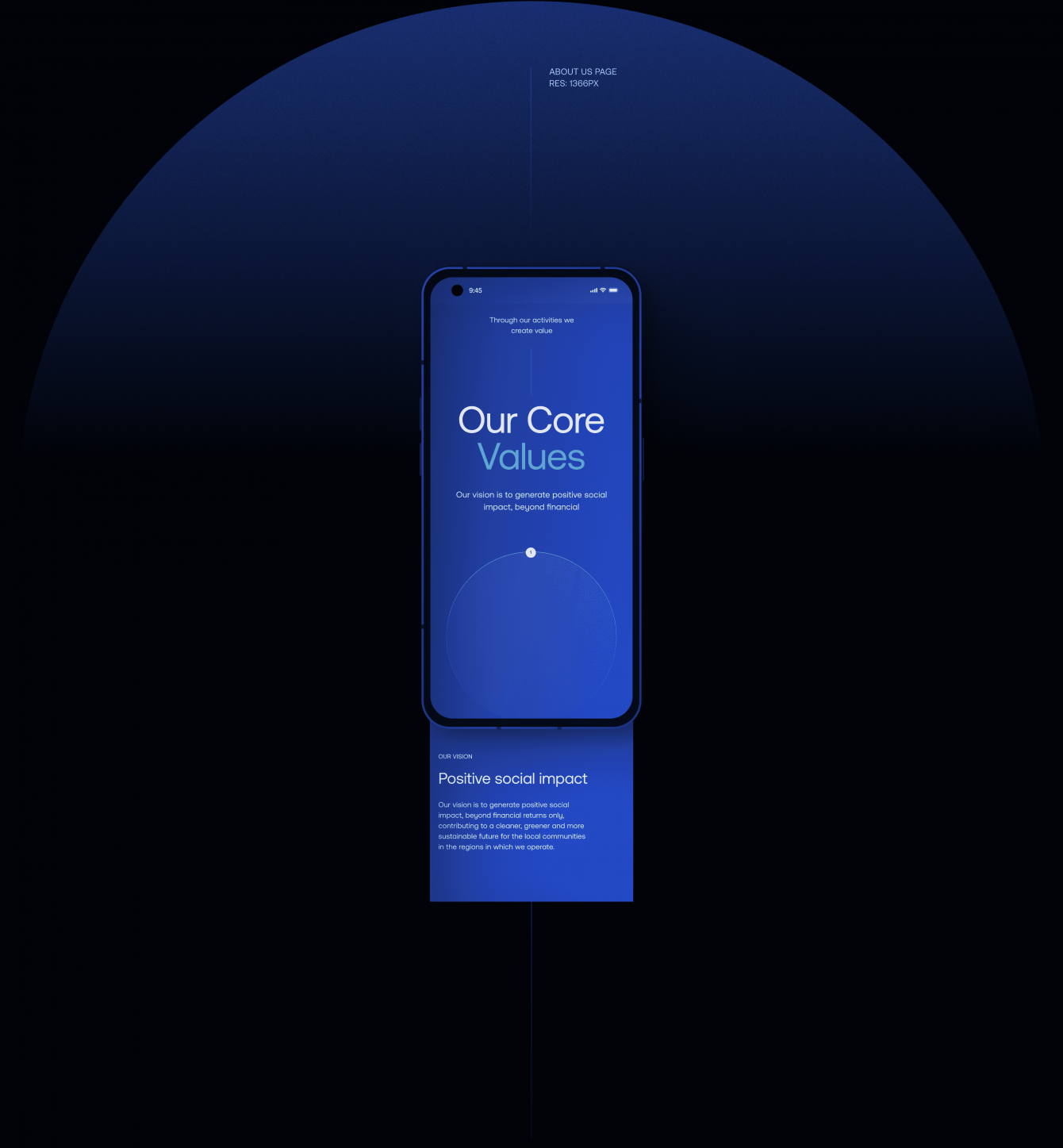 Общая концепция сайта передает фурустическую эстетику, с которой ассоциируются современная возобновляемая энергетика и инвестиции в будущее. Чтобы добиться этого эффекта мы использовали блюр, градиентную заливку, 3D-графику и абстрактные 2D-изображения.