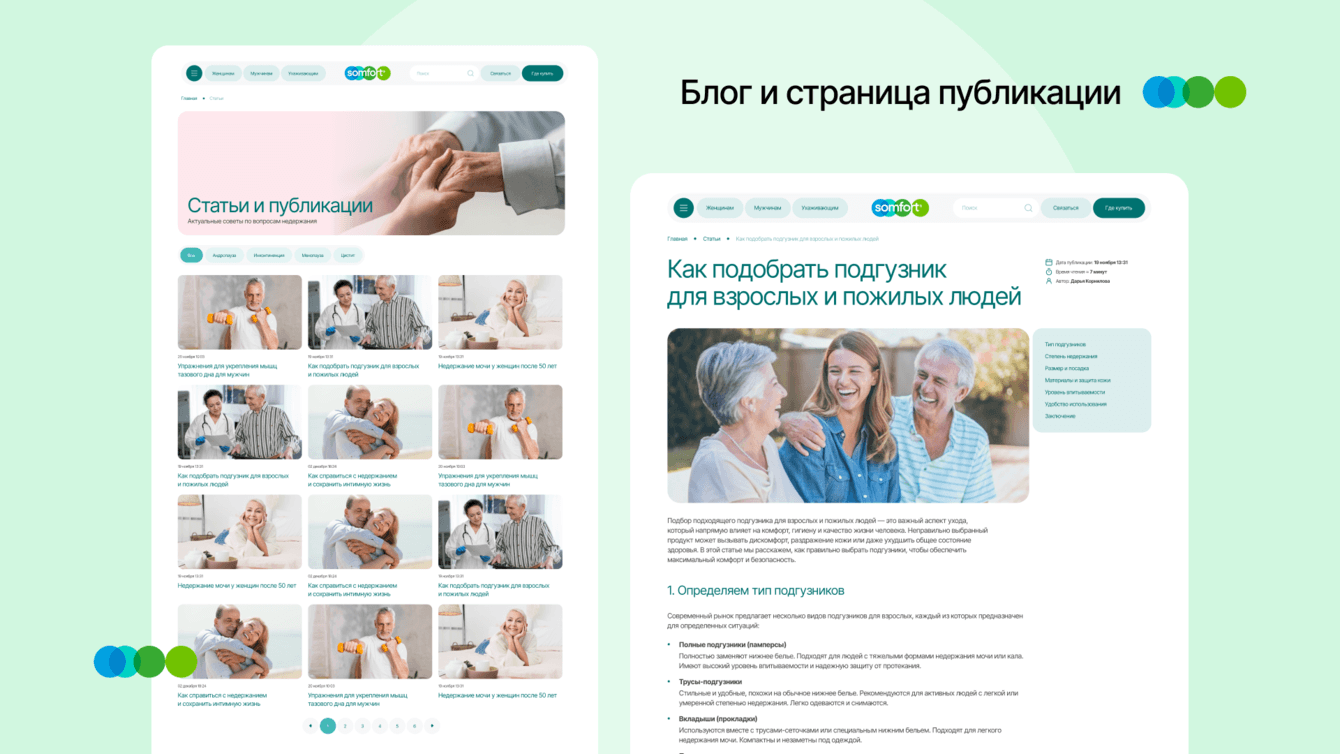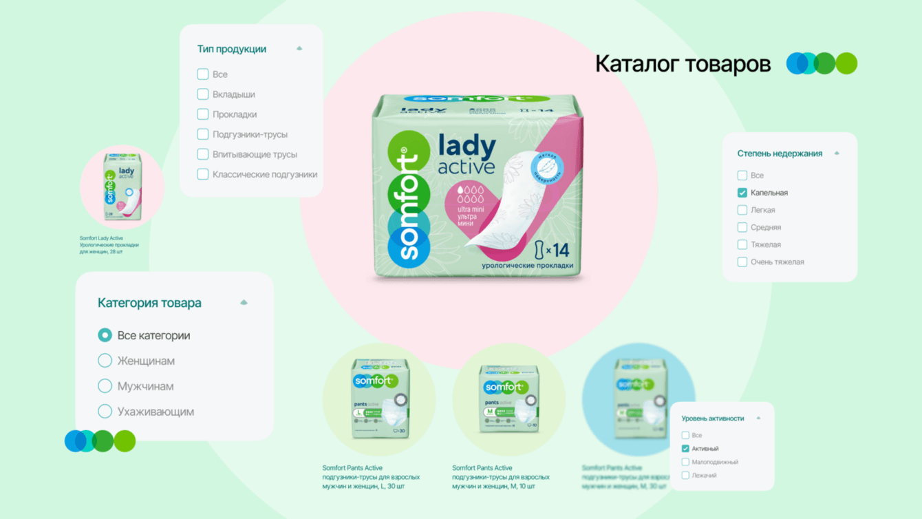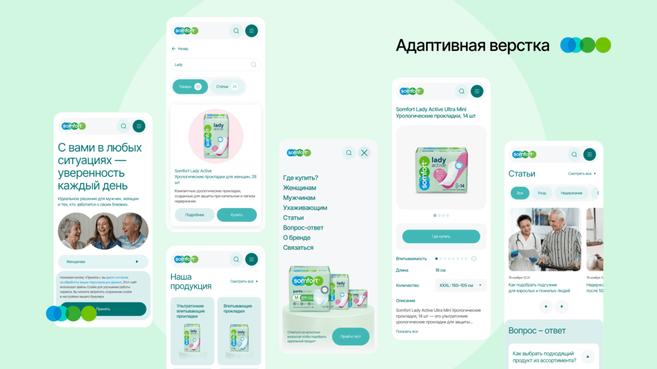 Мы запустили сайт somfort.ru за 3,5 месяца. Это удобный сервис, который помогает людям с недержанием жить комфортнее. Пользователь подбирает продукт, читает истории и советы, и при этом не испытывает психологического дискомфорта. Для бренда это означает больше доверия, формирование лояльности и укрепление узнаваемости на рынке.
