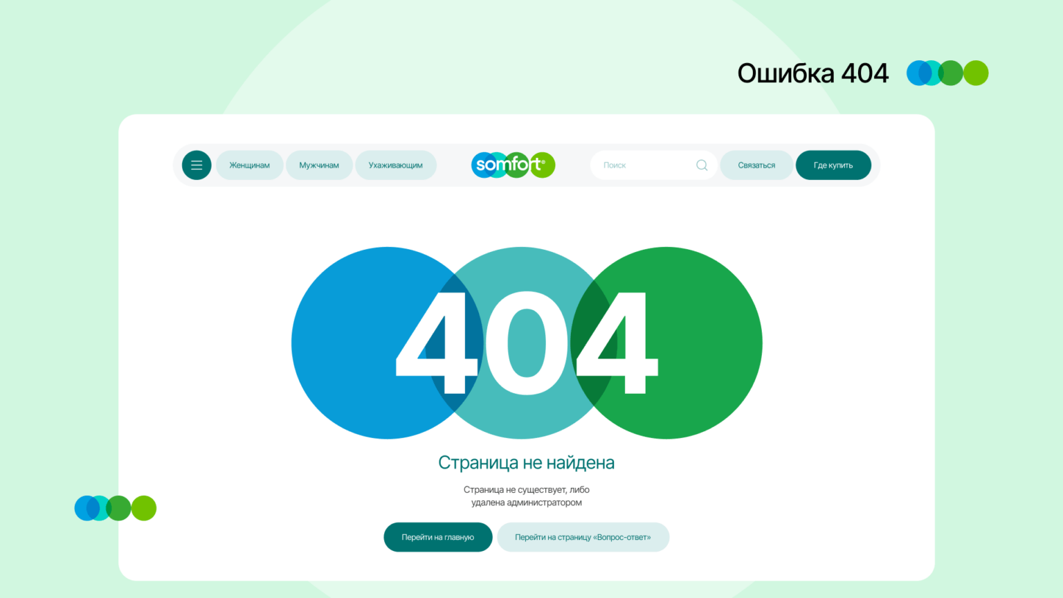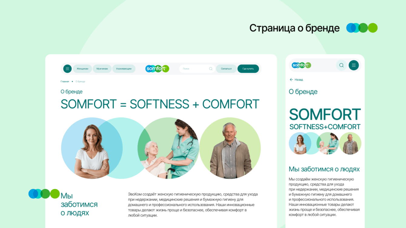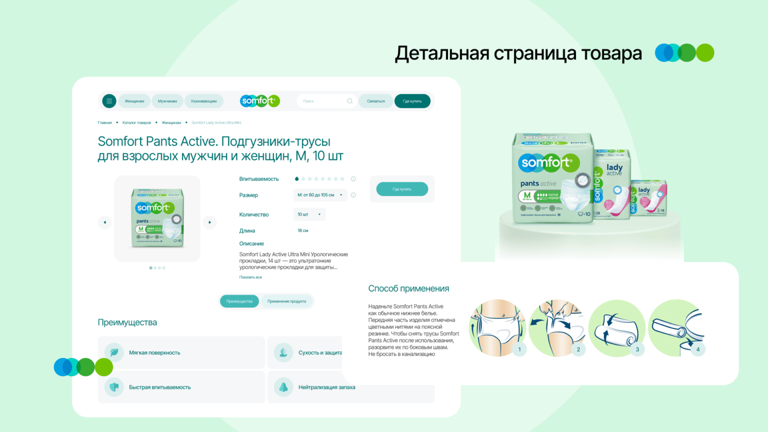 Мы запустили сайт somfort.ru за 3,5 месяца. Это удобный сервис, который помогает людям с недержанием жить комфортнее. Пользователь подбирает продукт, читает истории и советы, и при этом не испытывает психологического дискомфорта. Для бренда это означает больше доверия, формирование лояльности и укрепление узнаваемости на рынке.