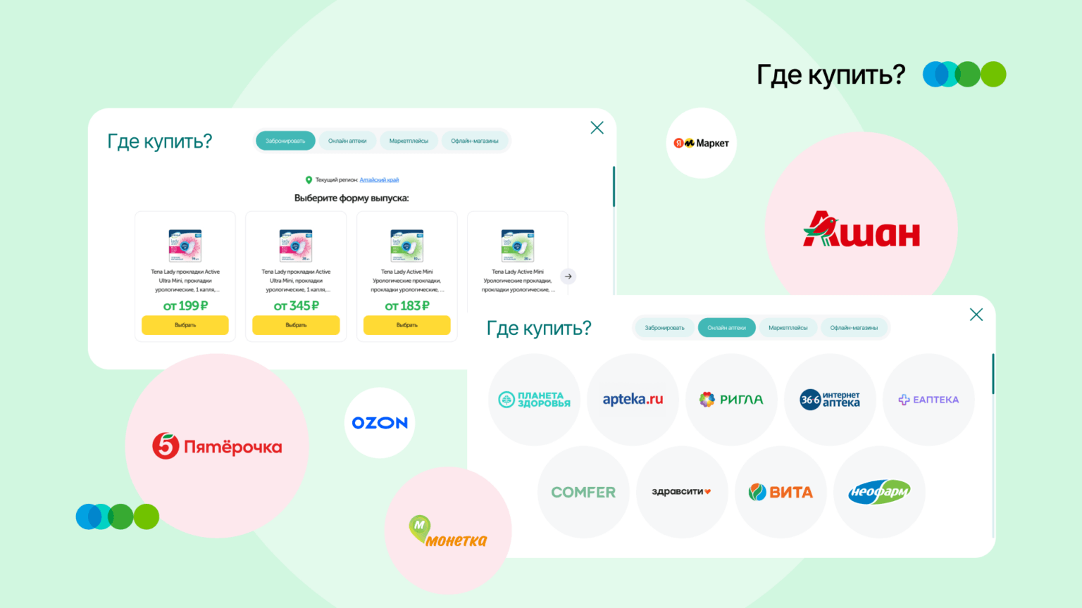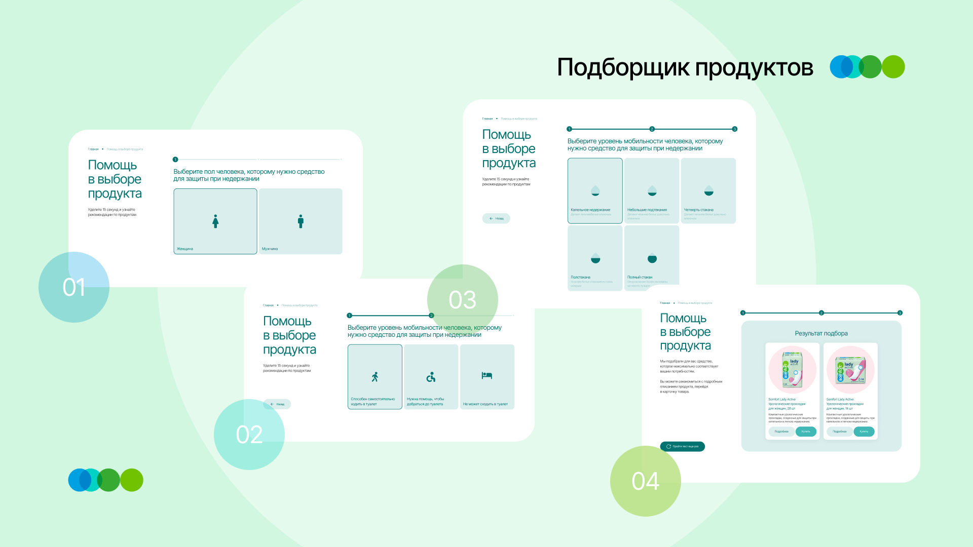 Мы сделали путь к выбору продукта максимально интуитивным: человек быстрее находит нужный товар благодаря продуманной структуре, короткому тесту и понятной навигации по линейкам, размерам и уровню впитываемости.