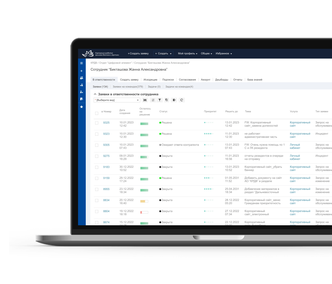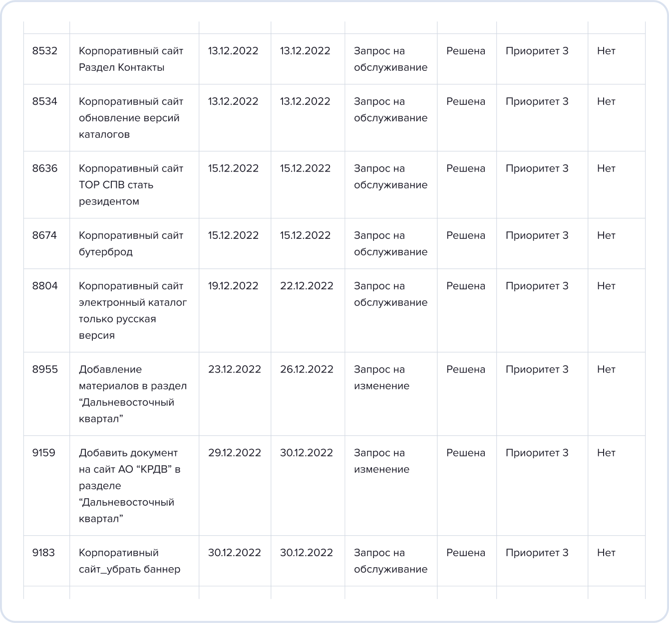 Было организовано несколько категорий запросов: Инцидент, Запрос на изменение и Запрос на обслуживание. По последнему типу мы организовали поддержку для сотрудников Заказчика по вопросам функционирования веб-сайта, личного кабинета, панели администрирования.