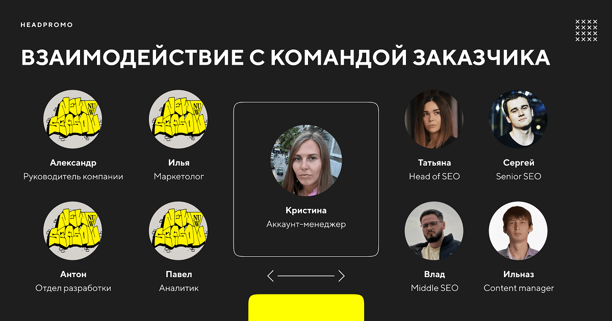 Ещё на пресейле мы выясняем потребности заказчика и формируем проектную команду. Отбор проходят аккаунт-менеджеры и SEO-специалисты. Смотрим на опыт работы в схожих тематиках, на требуемый уровень коммуникации, в том числе с дизайнерами и разработчиками.