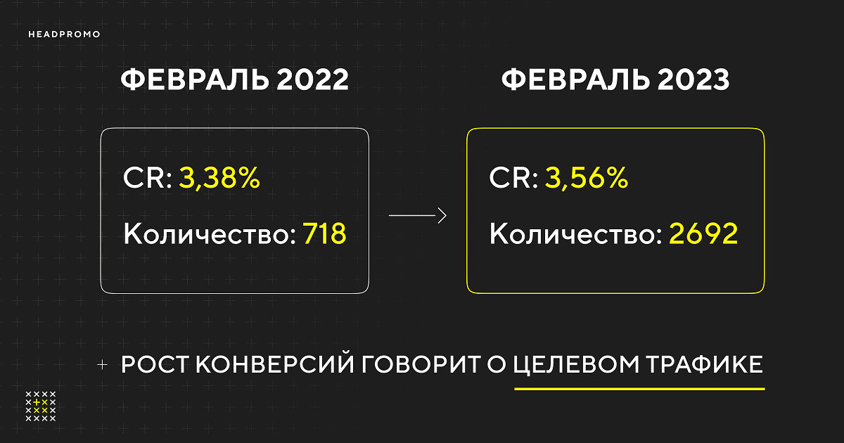 Увеличили показатели конверсии, как в количественном: 718 - 2668 , так и в процентном соотношении: 3,38 - 3,56