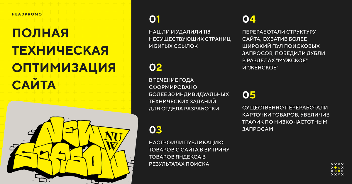 Параллельно устранили 118 несуществующих страниц и битых ссылок, добавили директивы clean-param и разделение по ПС в robots.txt, настроили canonical, отработали показатели по скорости загрузки сайта.