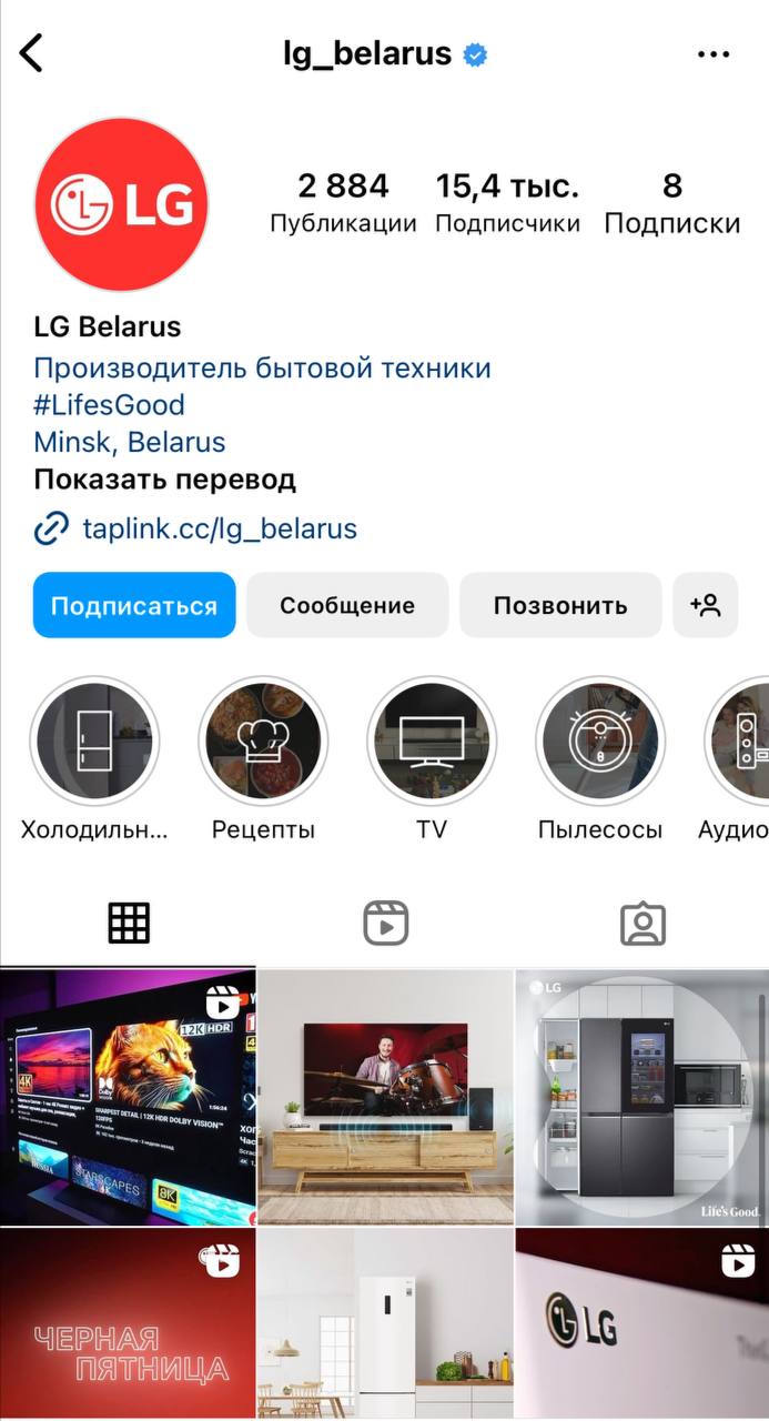 - Главная задача бренда в соцсетях – избавить покупателя от «тяжёлого» шопинга. Контент, рубрики и визуальная стратегия построены с упором на демонстрацию возможностей техники LG.
