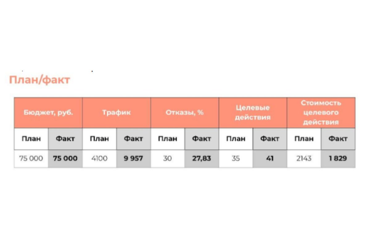 В первый же месяц ведения рекламных кампаний мы получили 32 лида и 41 конверсионное действие. Средняя стоимость обращения составила 1829 руб., что ниже на 14%, чем мы планировали.