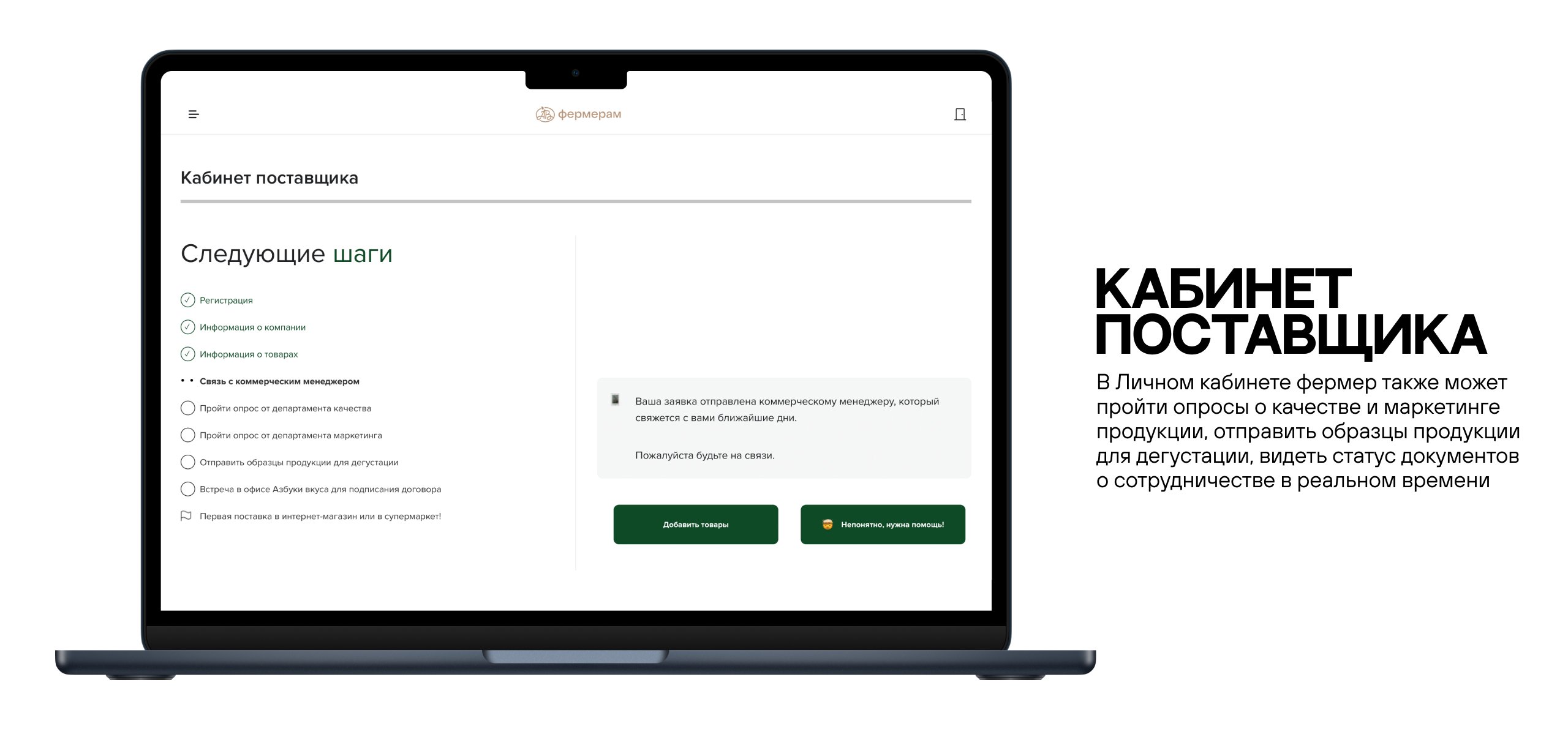 Сделать процесс входа в партнерство нагляднее и понятнее. Сделать его нужно было таким, чтобы фермер мог сам вносить все необходимые данные и не путался в обилии информации. Фермер сразу после заявки должен был видеть: сколько усилий нужно затратить на партнерство, какие этапы ему придется пройти и какие документы придется собрать. Все это удалось воплотить в Личном кабинете поставщика.