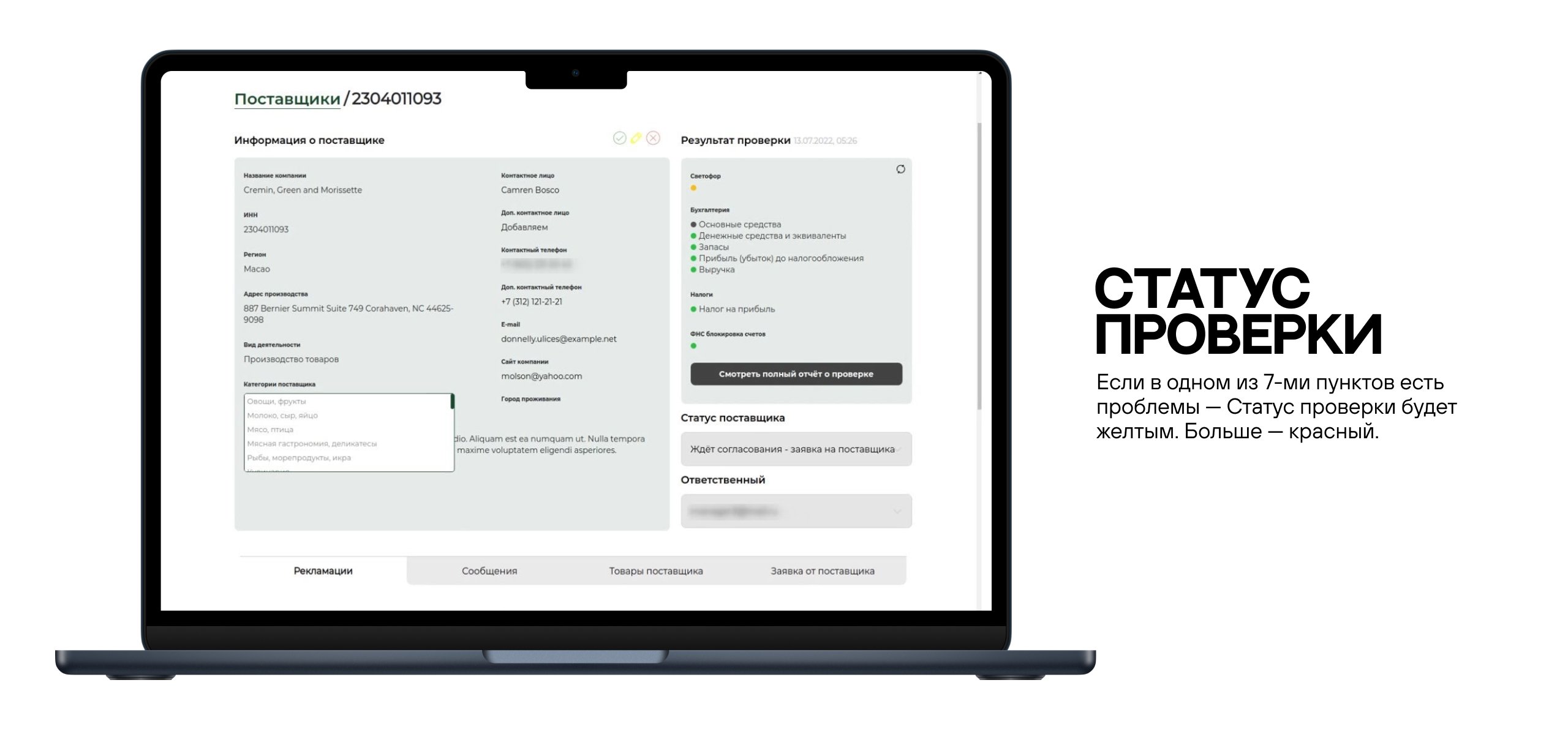 Заявки с зеленым Статусом проверки менеджеры обрабатывают в первую очередь. После переходят на желтые и красные. Цвет Статуса проверки определяется по 7 пунктам: основные средства, денежные средства и эквиваленты, запасы, прибыль (убыток) до налогообложения, выручка, налог на прибыль, ФНС блокировка счетов. Если в одном из 7-ми пунктов есть проблемы — Статус проверки будет желтым. Больше — красный.