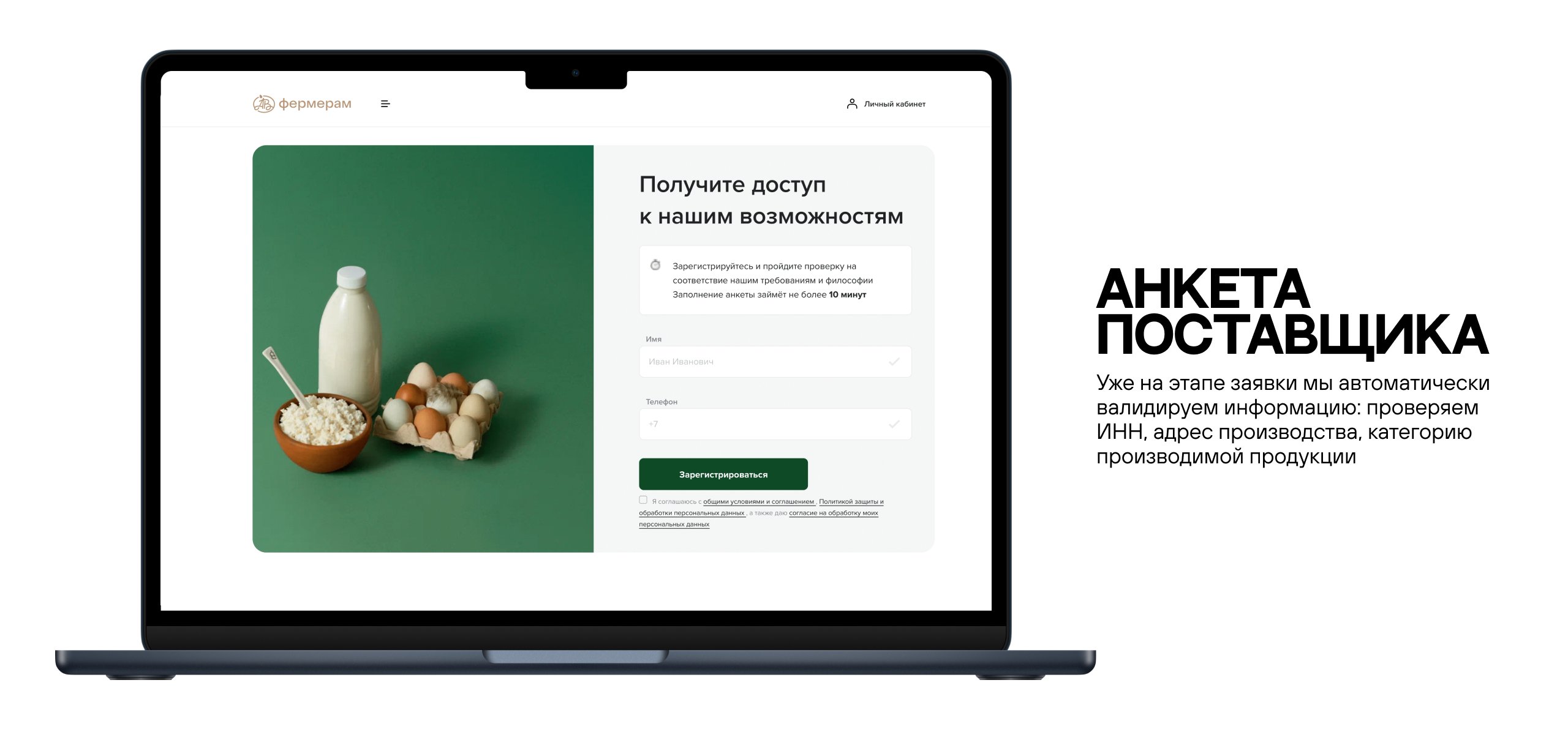Все заявки теперь принимаем на лендинг. В заявке фермер сразу заполняет основные данные о своем предприятии. Уже на этапе заявки мы автоматически валидируем информацию: проверяем ИНН, адрес производства, категорию производимой продукции.