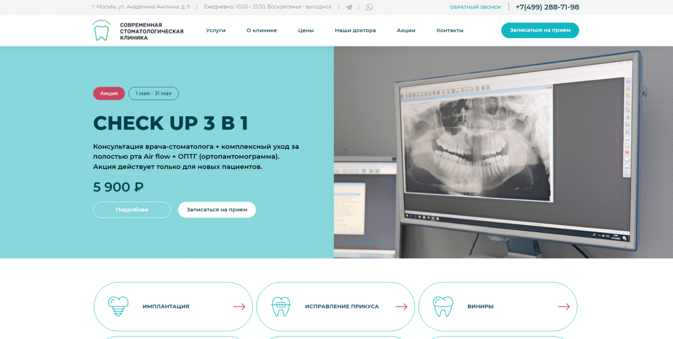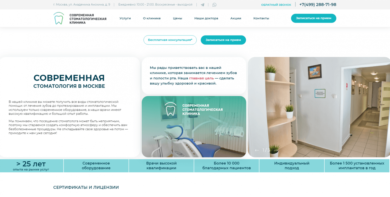 Сайт адаптивен и отлично работает на любых устройствах. Пользователи могут легко записаться на приём, узнать о предоставляемых услугах и получить всю необходимую информацию о клинике. Мы продумали интерфейс сайта, чтобы сделать взаимодействие с ним максимально комфортным и интуитивно понятным.