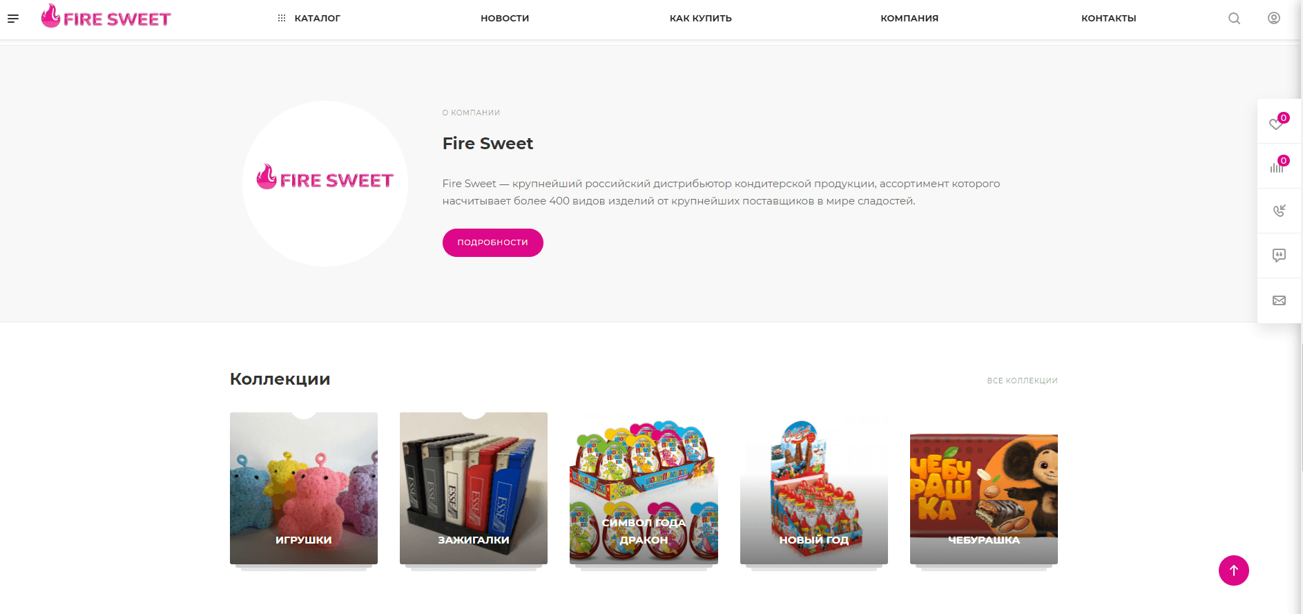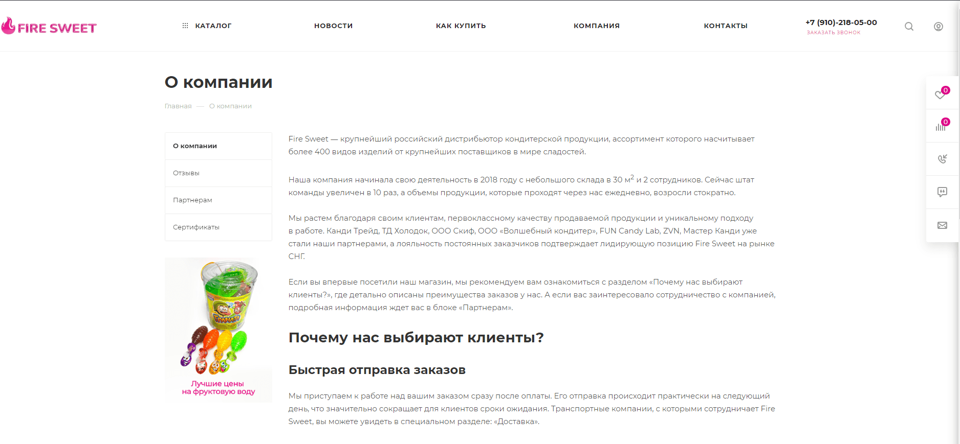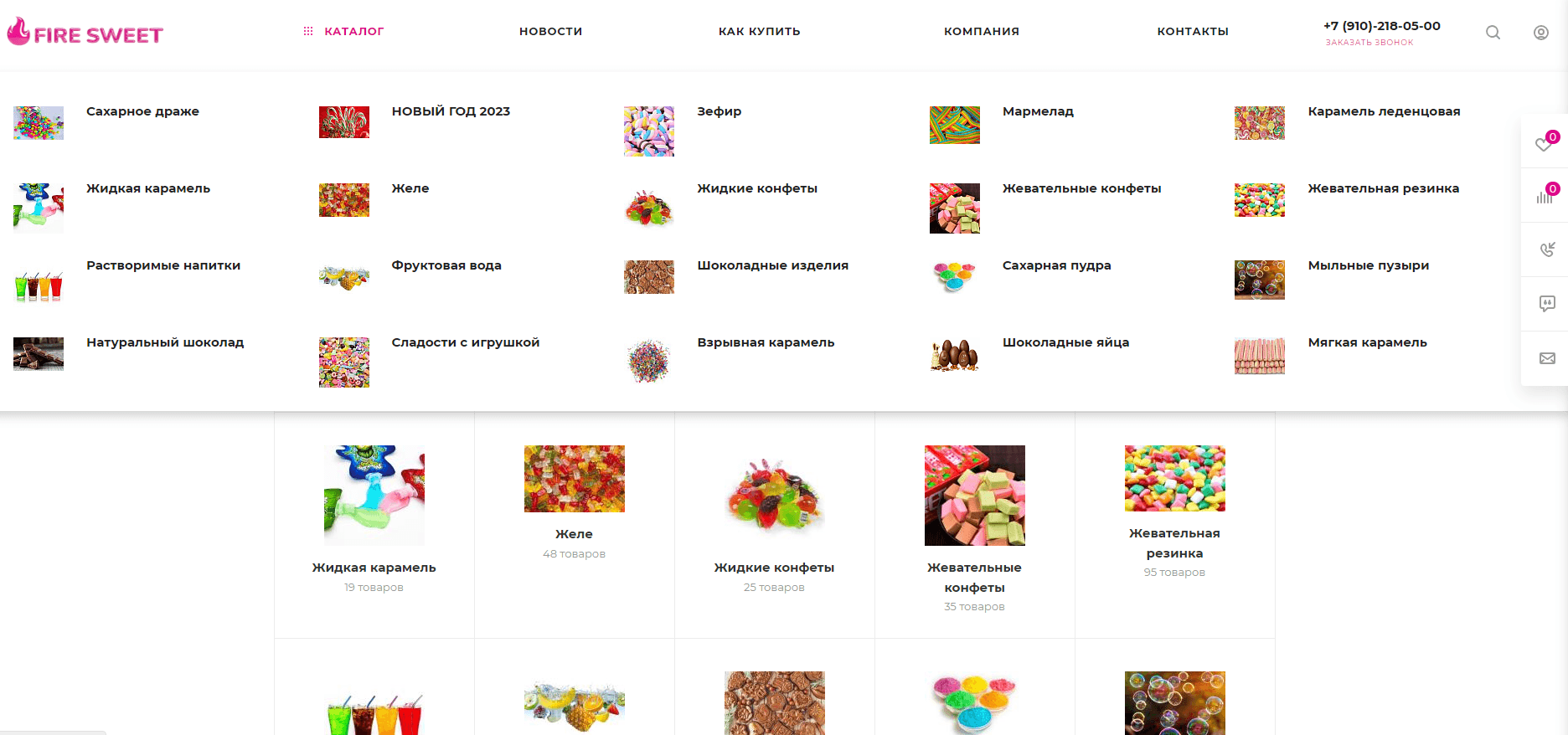 Элементы дизайна, наполнение сайта и визуал выполнены в карамельном стиле. Все яркое, броское, но не перегружает пользователя. Обилие информации не путает пользователя. Сайт выполнен с любовью к сладостям и заказчику.