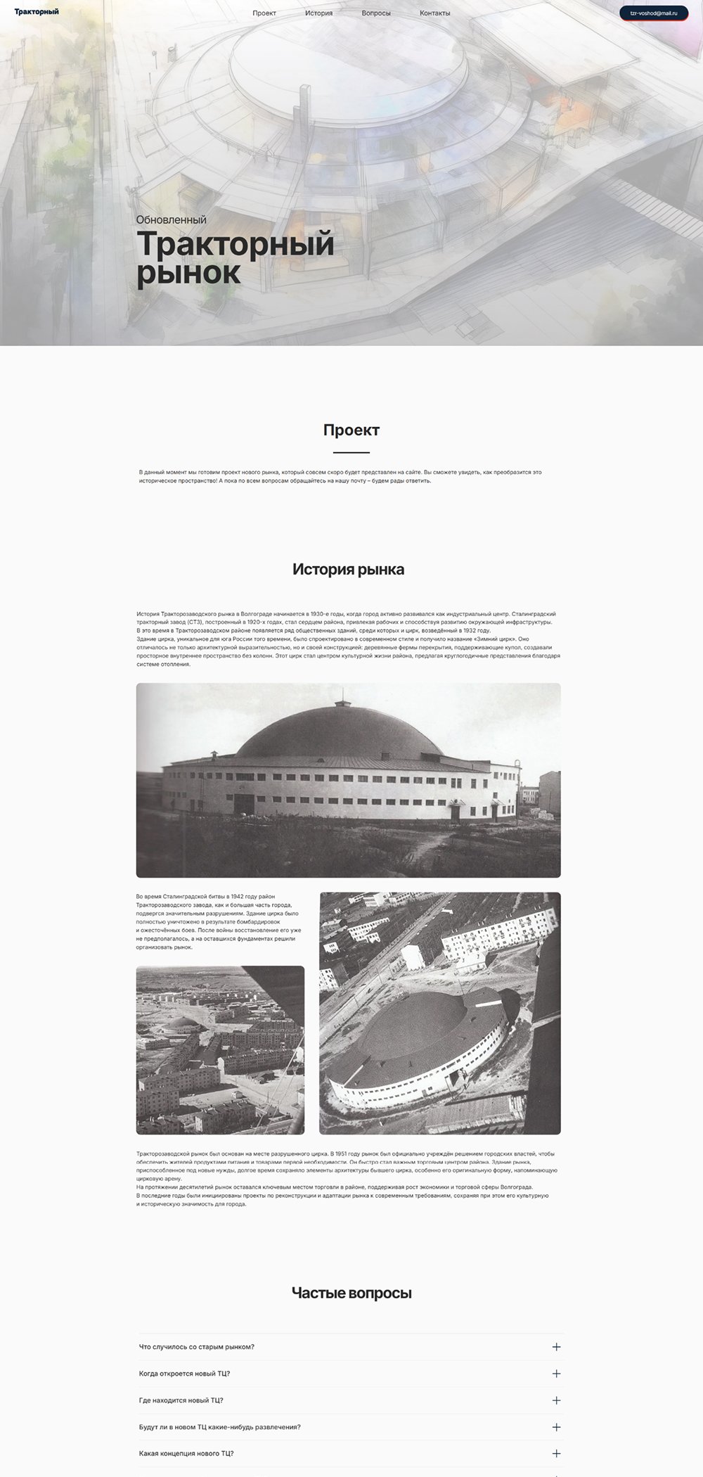 В результате мы создали высокофункциональный и удобный сайт для Тракторозаводского рынка, который отвечает современным требованиям и обеспечивает лёгкий доступ к актуальной информации. Проект прошёл все этапы - от концептуализации до оптимизации, с особым вниманием к удобству пользователей, скорости загрузки и актуализации данных.