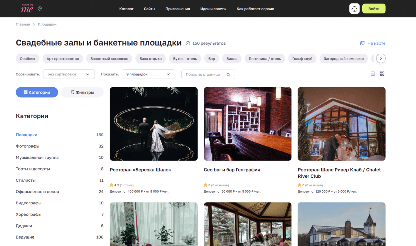 - Подбор специалистов: Легкий поиск и выбор ведущего, фотографа и других подрядчиков для мероприятия.
