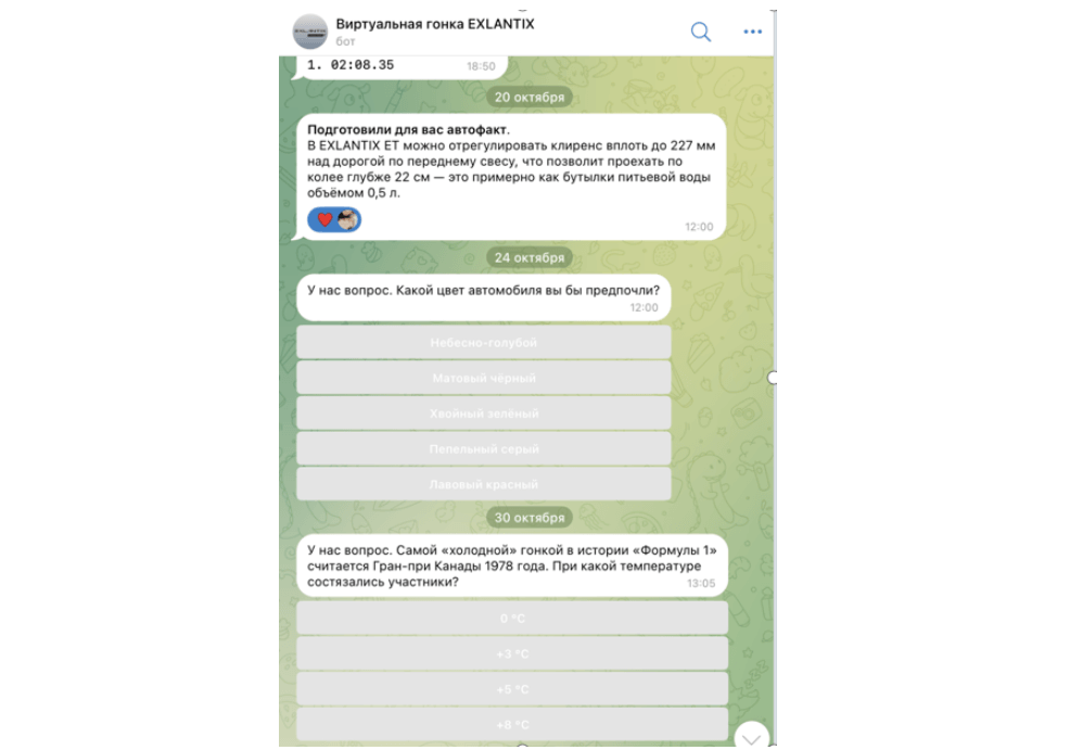 EXLANTIX ET и ES, связанных с темой гонок, 5 опросов о личных интересах и предпочтениях пользователей и 6 опросов-викторин на тему гонок и характеристик модельного ряда EXLANTIX.