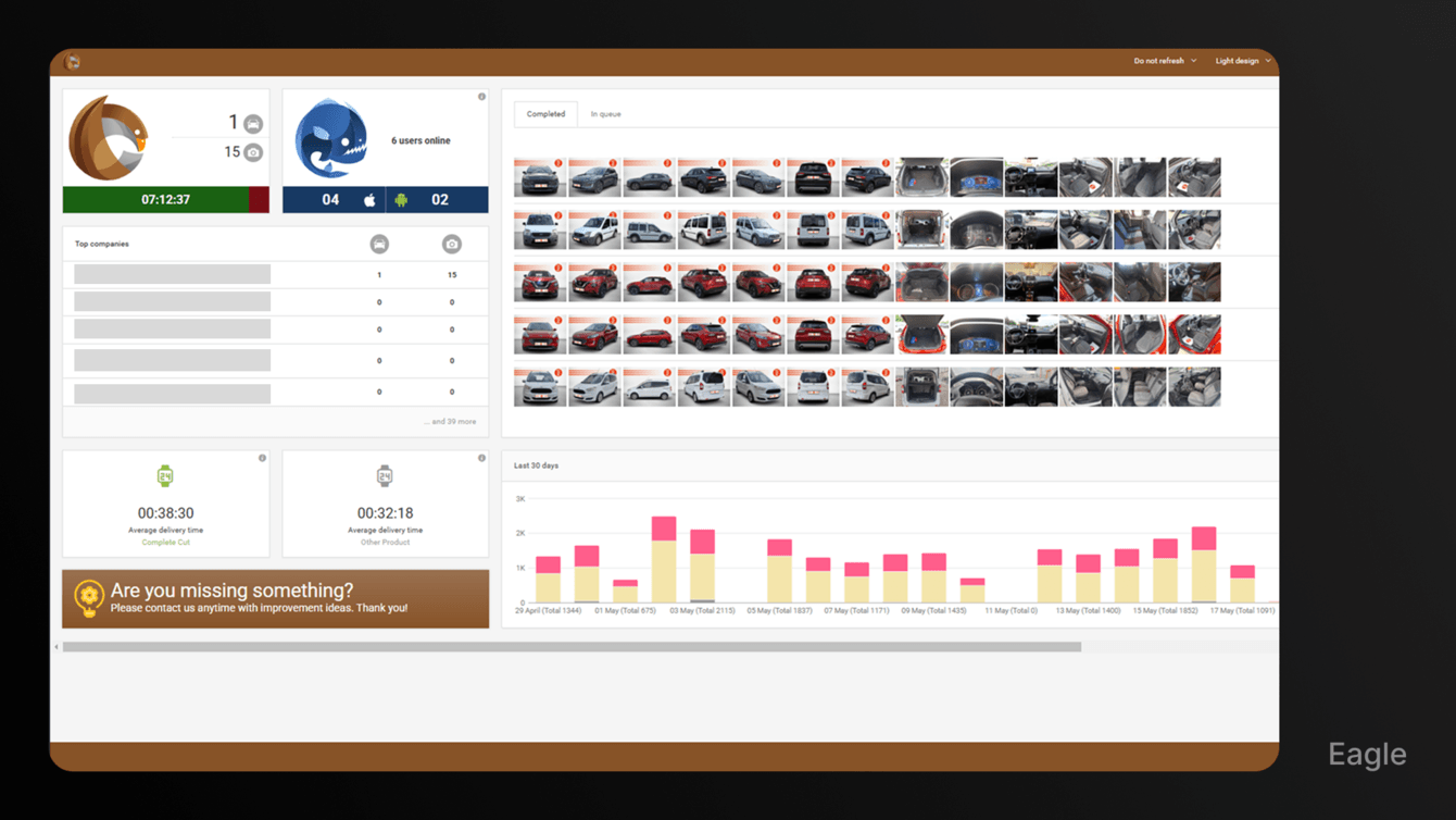 Eagle позволяет клиенту контролировать процесс: собирает метрики из всех сервисов, например, количество обработанных фотографий, скорость обработки и статусы.
