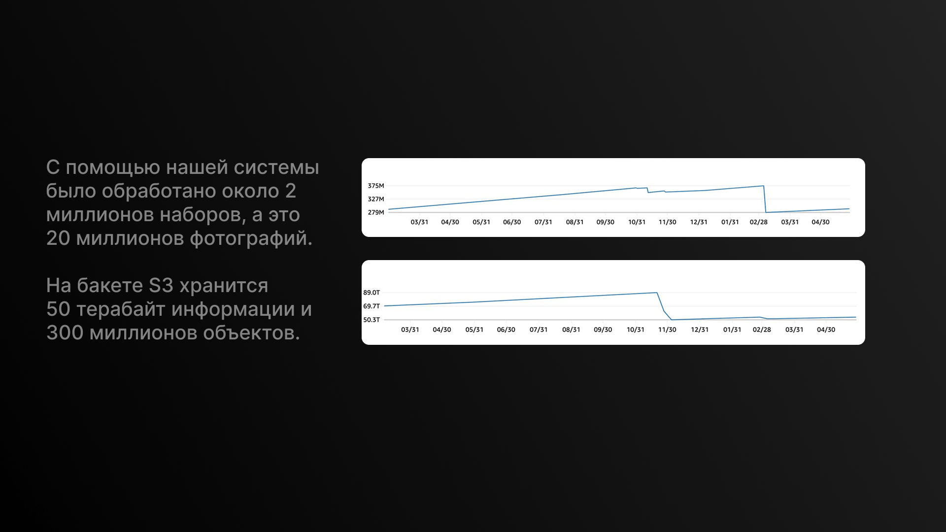 Также мы пересмотрели логику хранения архивов. Настроили автоматическое правило, которое удаляет старые архивы после исчезновения юридических обязательств по их хранению. В результате объём облака снизился до 50 терабайт, и клиент в разы меньше платит за хранение и поддержку инфраструктуры.