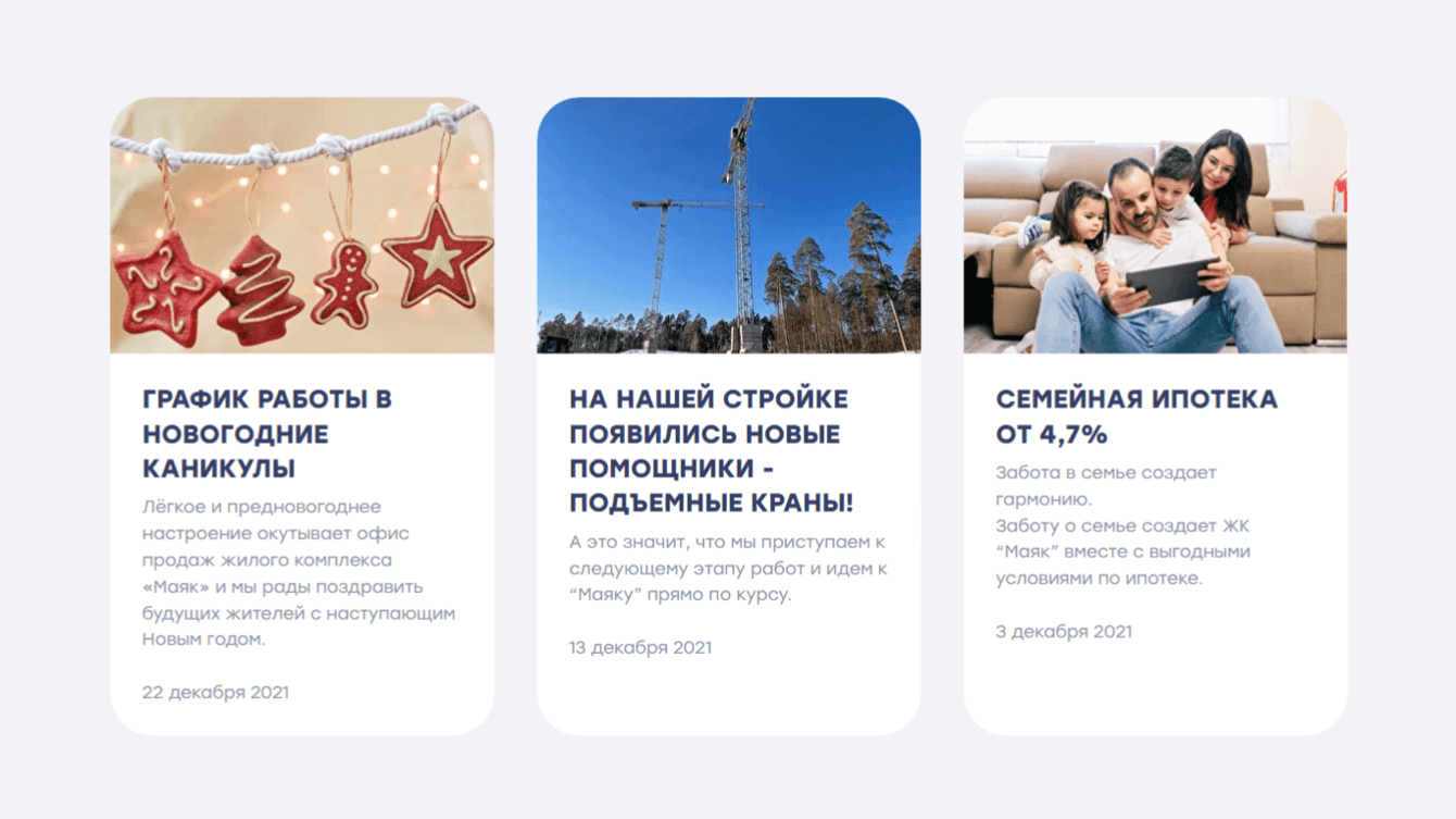 Чтобы пользователь мог наблюдать за активностью застройщика, быть в курсе интересных предложений и новостей, на сайте представлен блог «События»
