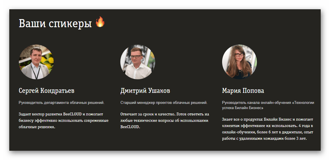 Представили спикеров. Сделали для каждого короткое описание, которое подчеркивает его компетентность: рассказали об опыте и специфике работы, указали на роль спикера в предстоящем занятии