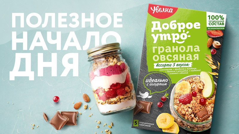 Гранола — легкий и питательный завтрак, который набирает стремительную популярность в городах-мегаполисах. Достаточно залить нежные запеченные хлопья любимым продуктом — и все готово! Такой завтрак трудно представить без красивой посуды. Именно поэтому мы поместили стеклянную чашу на упаковку, позволяя потребителю безошибочно узнать нужную категорию.