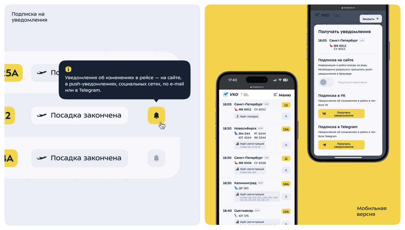 Пользователь может не проверять табло самому, а подписаться на обновления рейса и получать оповещения на сайте, по email, в VK или Телеграме. Система будет присылать оповещение о каждом изменении статуса рейса. С помощью одной кнопки можно отправить встречающему ссылку на рейс.