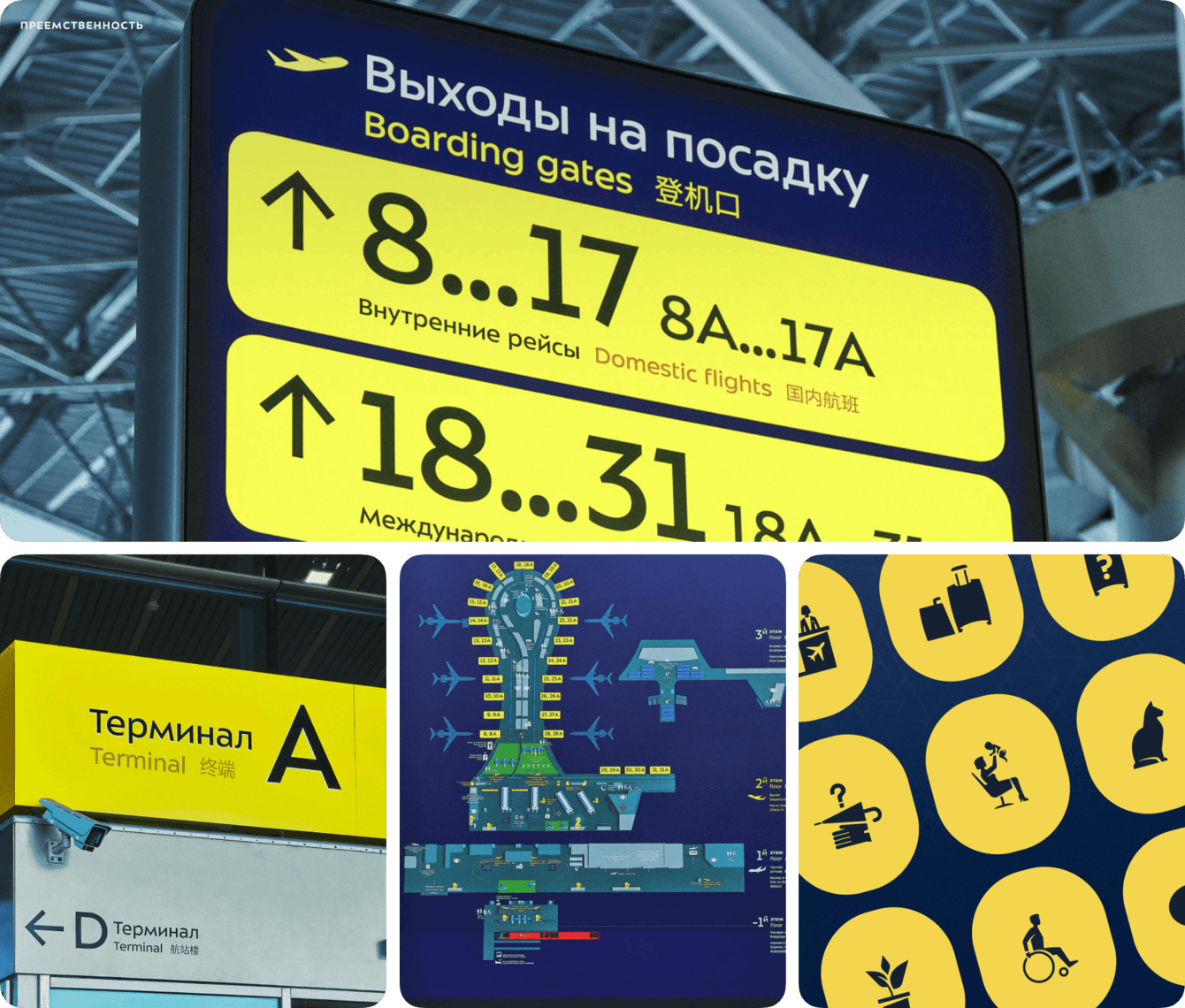 Мы объединили аэропорт и сайт, соединяя физическое и виртуальное. Сайт наследует айдентику аэропорта: использует те же цвета, указатели, шрифты, пиктограммы, чтобы сайт и здание были частями одного бренда.