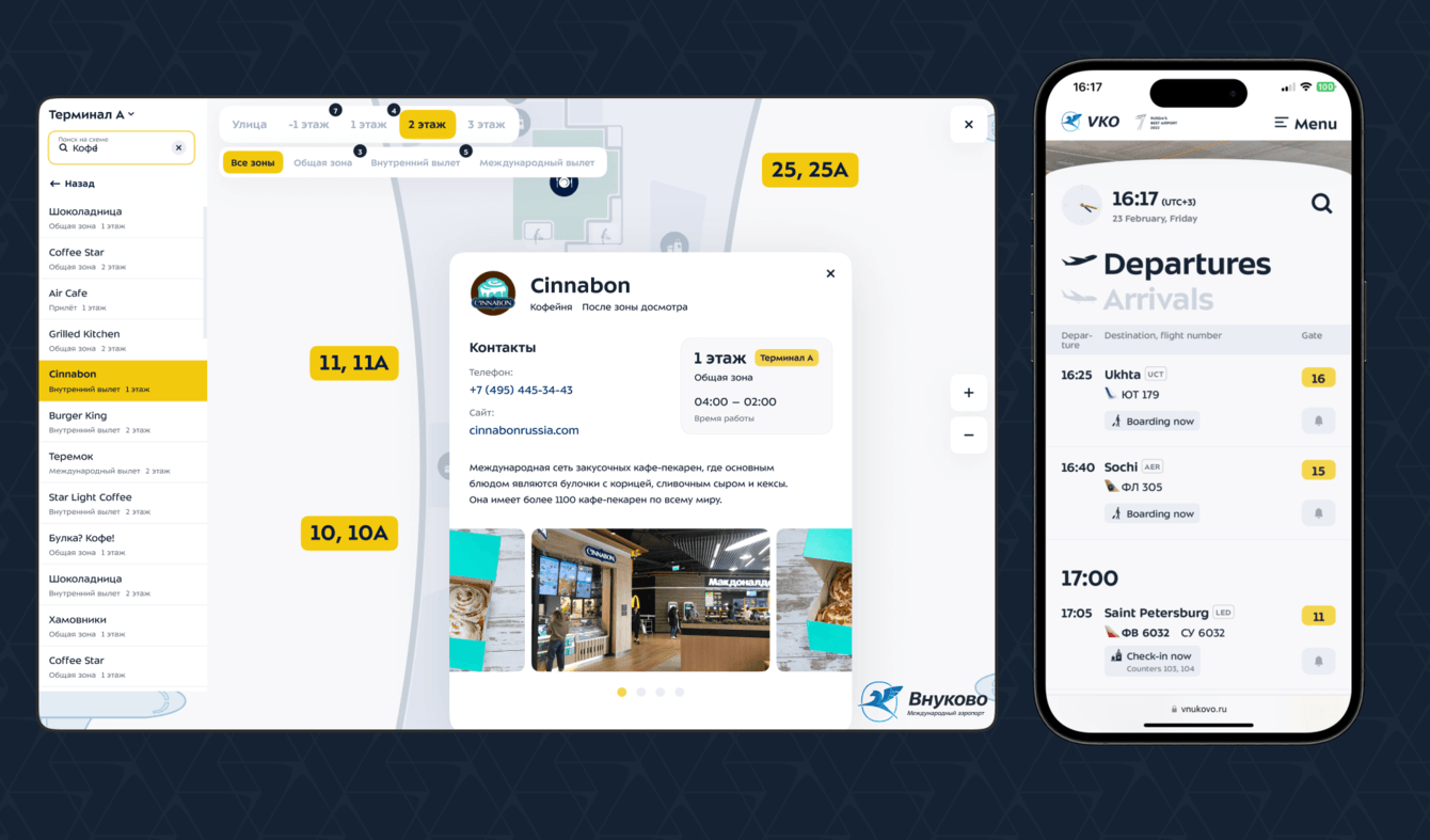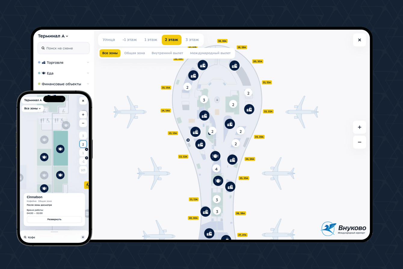 — Интерактивной схемой аэропорта: добавлять новые магазины и рестораны, удалять или отключать объекты на время.