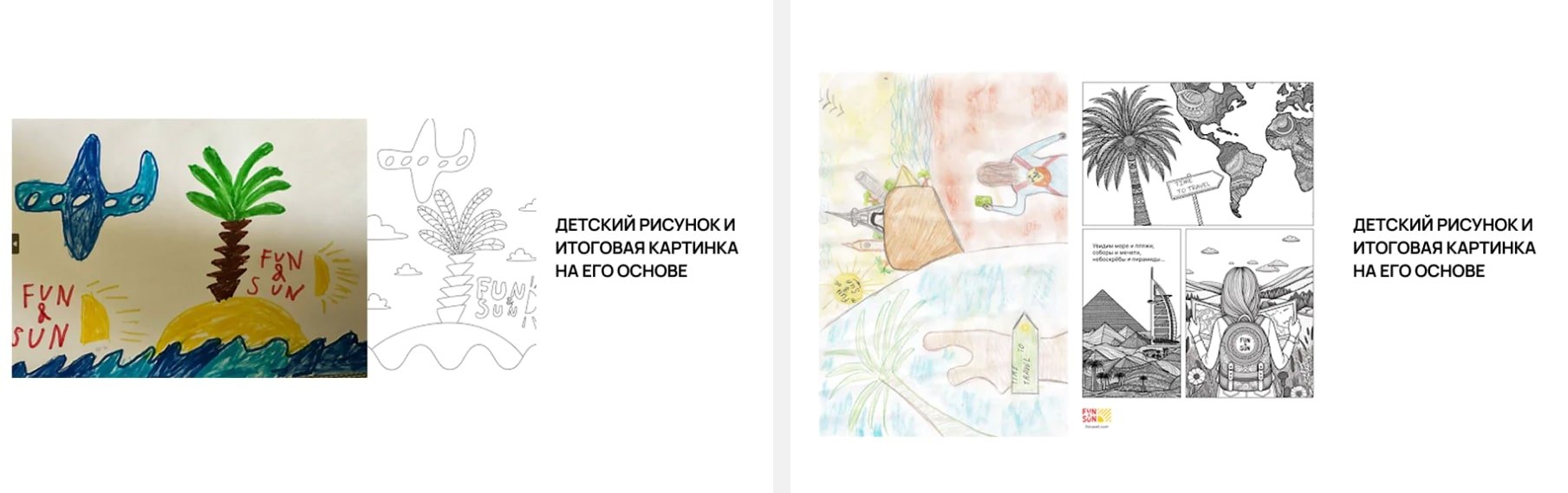 Поддержать лояльность сотрудников. Чтобы вдохновить их и сделать подарок, напоминающий о компании, клиент придумал сделать книжку-раскраску. Основой стали рисунки на тему путешествий, которые создали дети сотрудников.