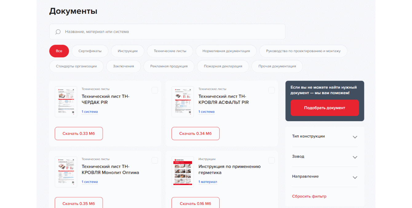 Собрали более 1 700 технических листов, заключений, пожарных деклараций и других нормативных правовых актов, регламентирующих строительную отрасль, сделали удобный поиск и систему фильтрации по типам документов, направлениям, заводам-изготовителям и типам конструкций.