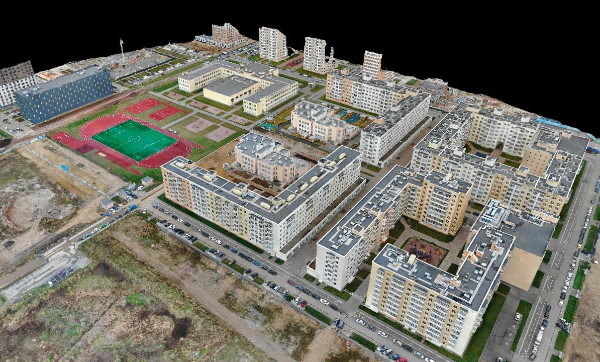 Никто и не заметил, что школа, спортивные площадки и детские сады — это реальные модели, созданные с помощью фотограмметрии, нам не пришлось их моделировать вручную. Мы сделали 3D сканирование территории с помощью квадрокоптера и из нескольких тысяч фотографий получили 3D модель поверхности. Вот как она выглядит: