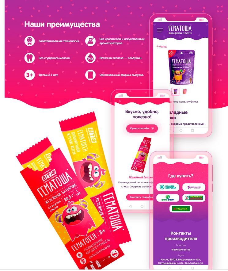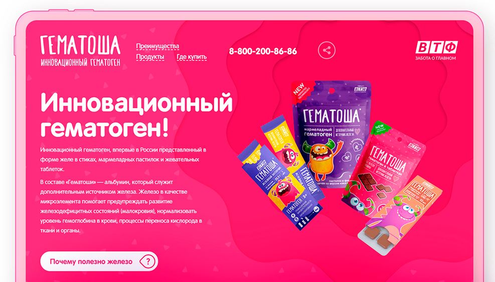 Создание адаптивного промо-сайта для уникального гематогена, выпускаемого ООО «ВТФ», впервые в России представленного в форме желе в стиках, мармеладных пастилок и жевательных таблеток.