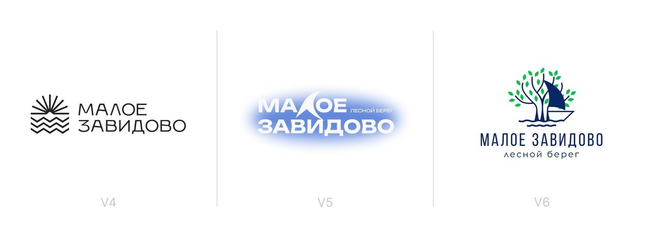 Клиент оценил дизайн, но попросил сделать акцент на словах «Малое Завидово», а «Лесной берег» предложил перенести в дескриптор. Кроме того, заказчик упомянул, что в посёлке планируется открытие гольф-клуба, яхты и конные прогулки, что можно было бы отразить в логотипе.