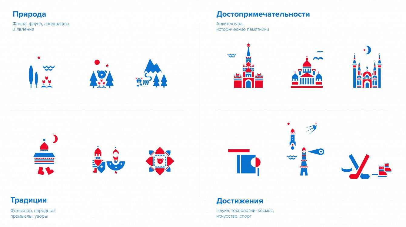 Элементы айдентики разделены на четыре основных направления: природа (флора, фауна, ландшафты и явления); традиции (фольклор, народные промыслы, узоры); достопримечательности (архитектура, исторические памятники); достижения (наука, технологии, космос, искусство, спорт).